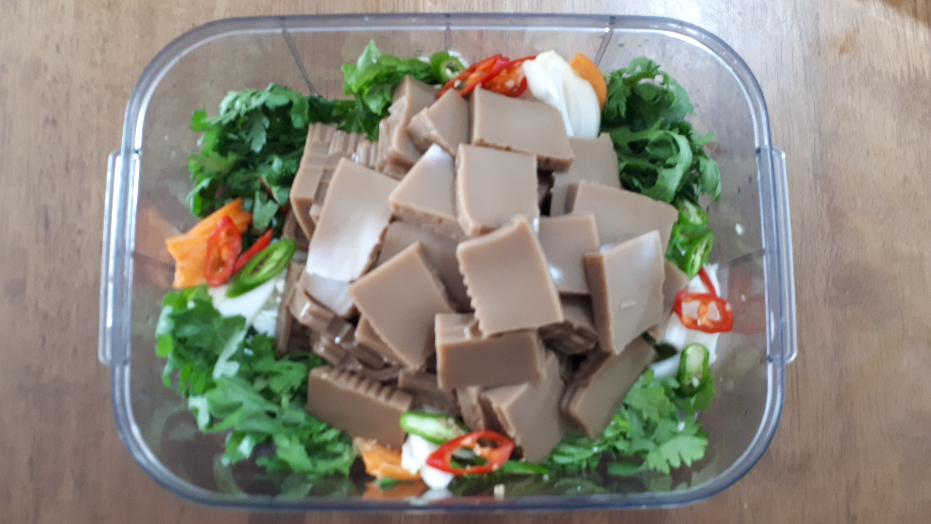 야채는 썰어 혼합하기 좋도록 4등분 돌려 담는다