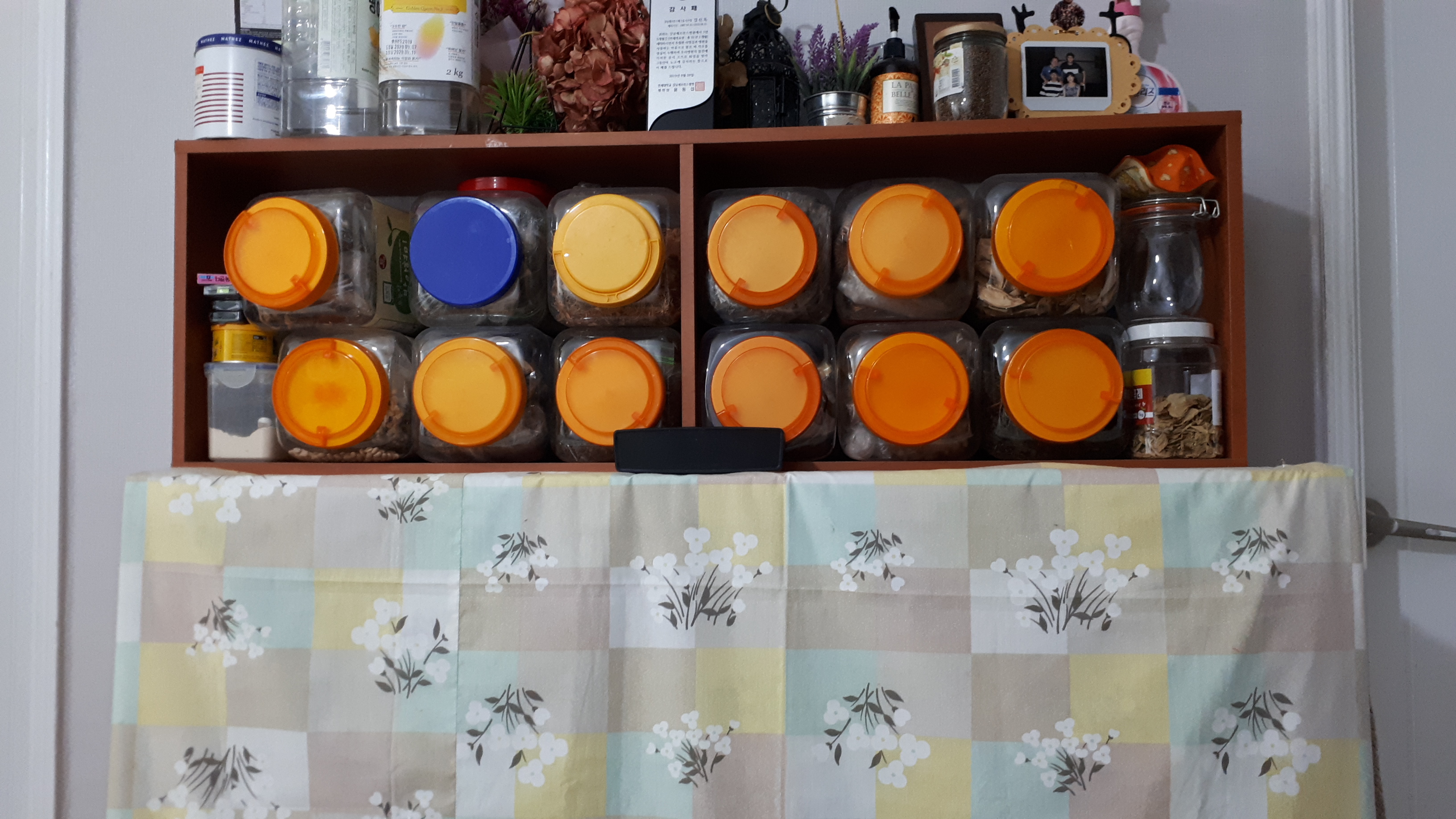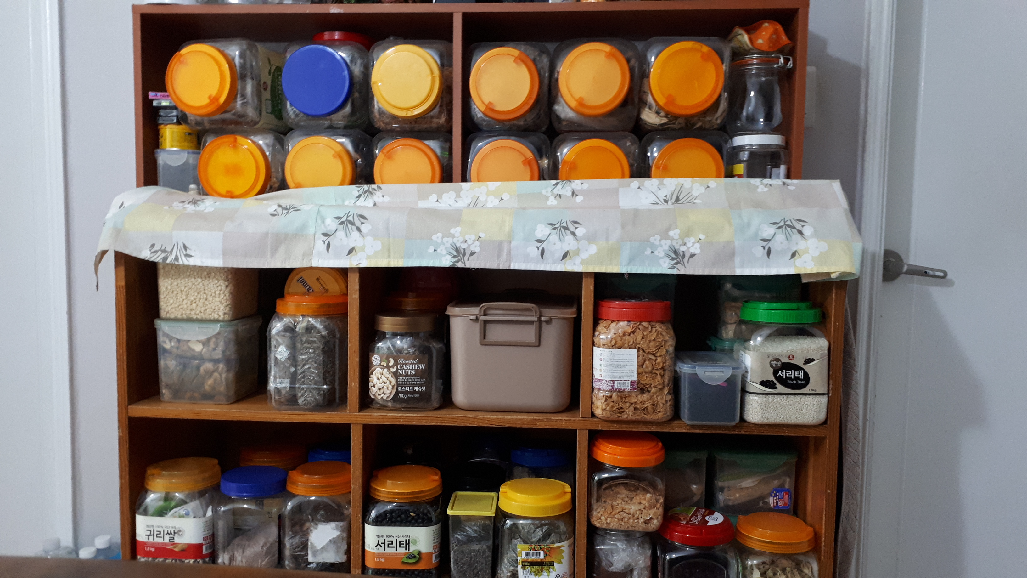 식탁 옆에 위치한 조미를 위한 저장고가 있다