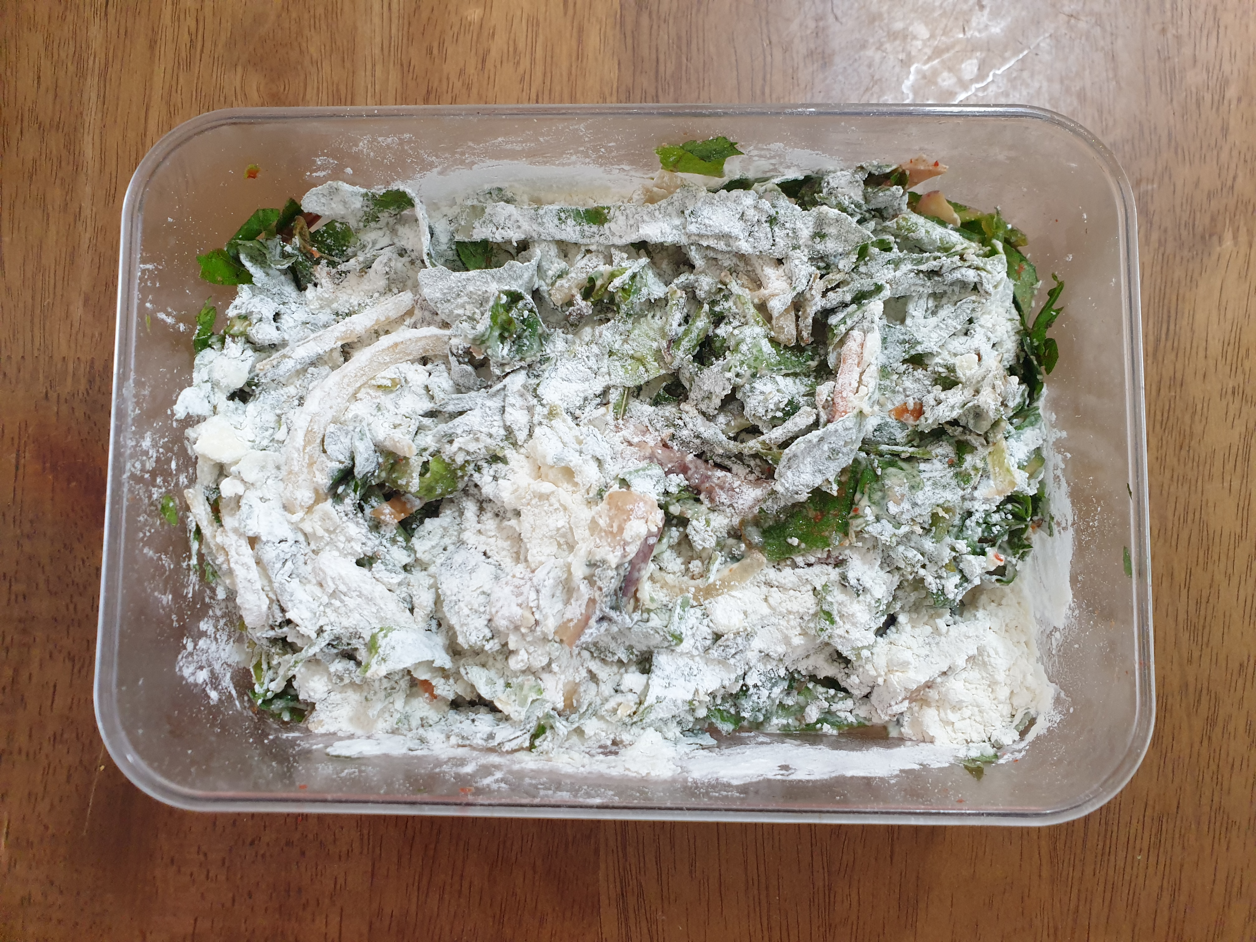 튀김가루 200g. 물은 150g쯤 넣고 섞어 전 반죽을 마쳤다