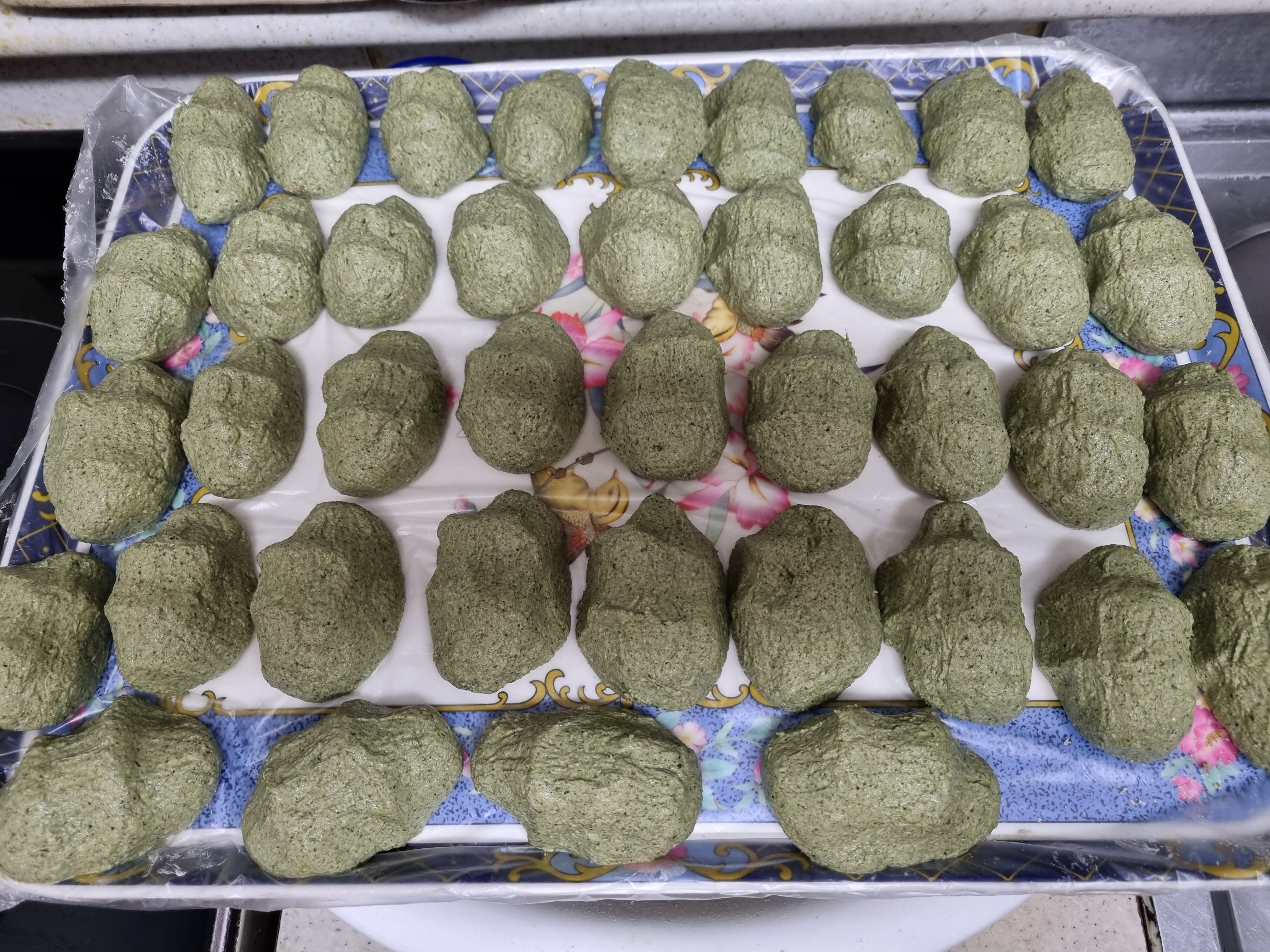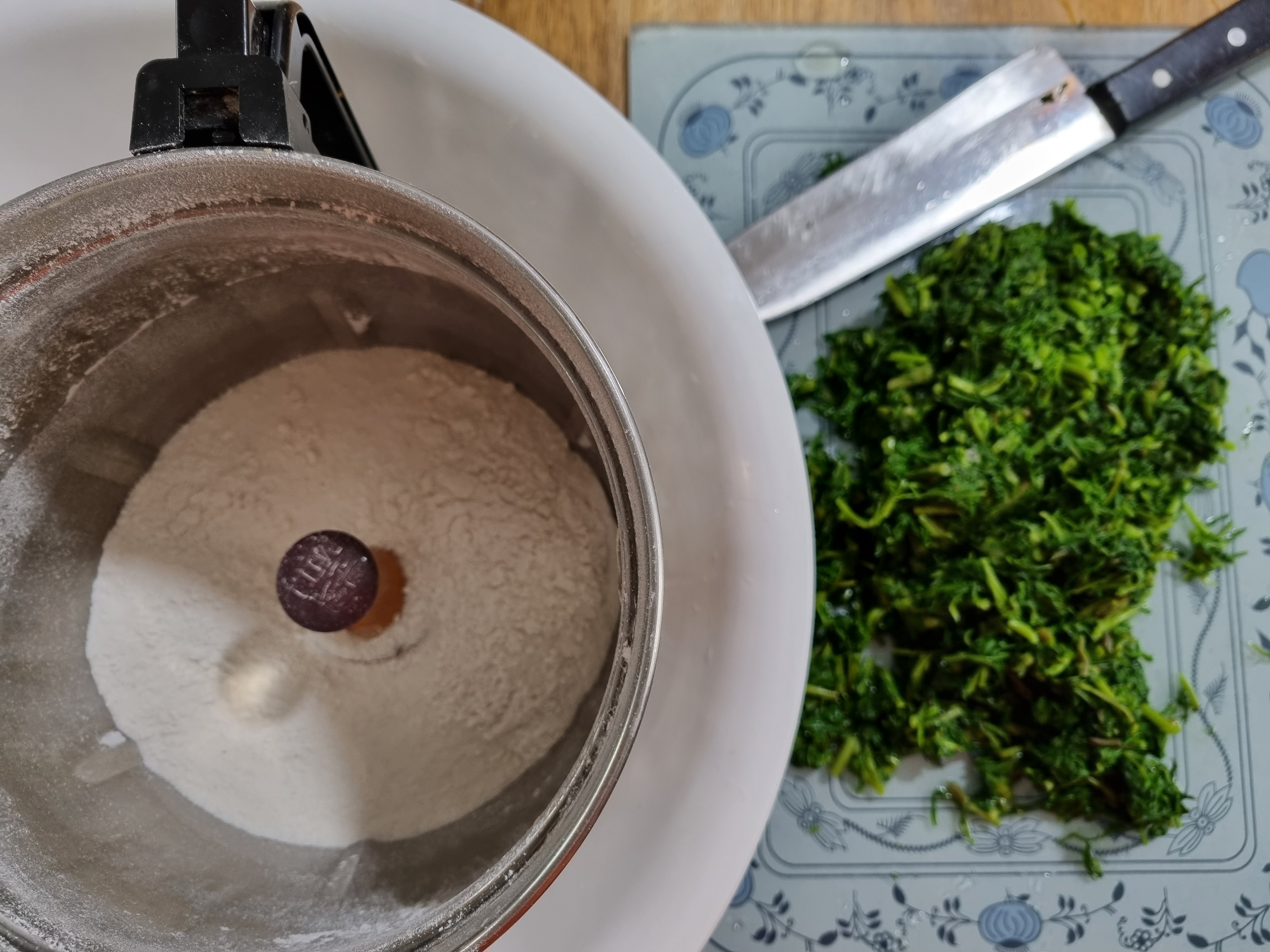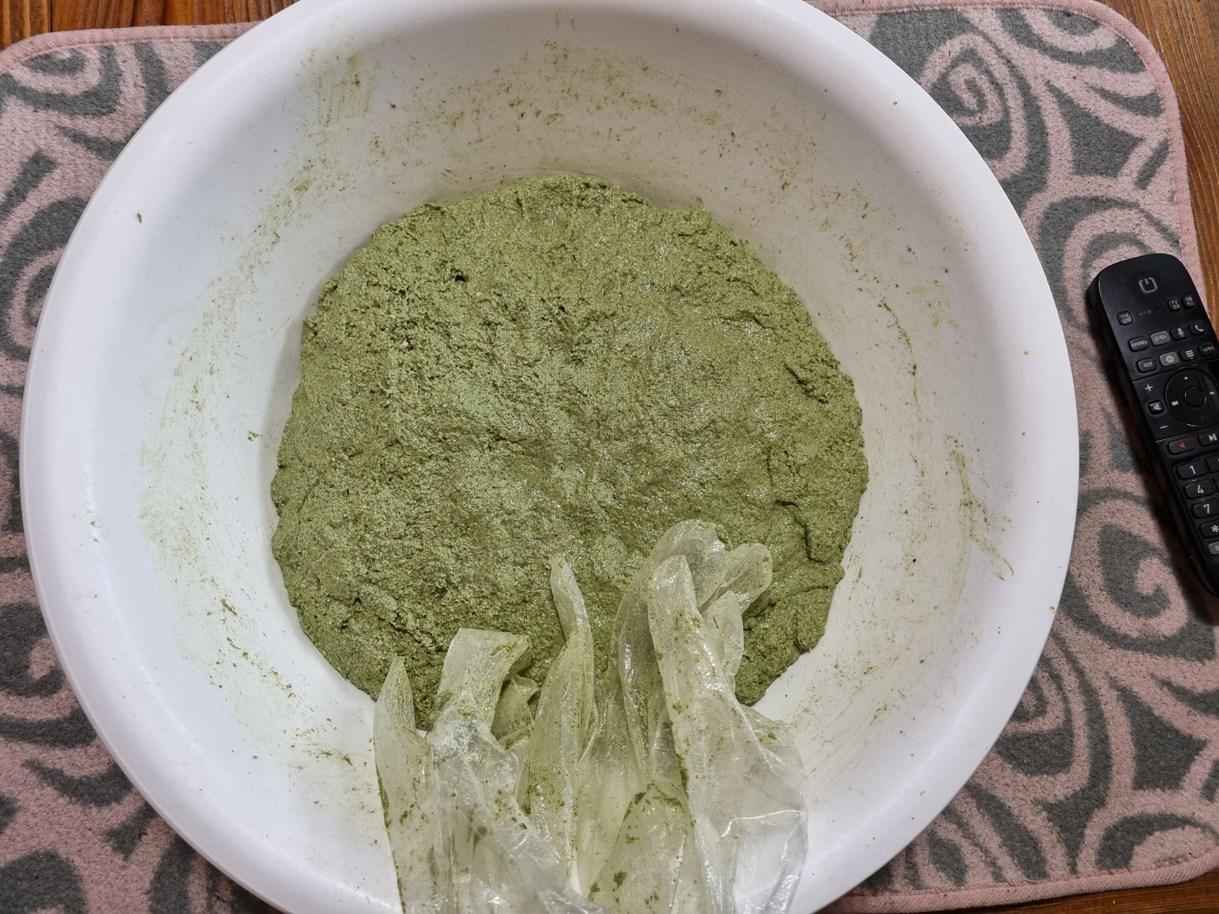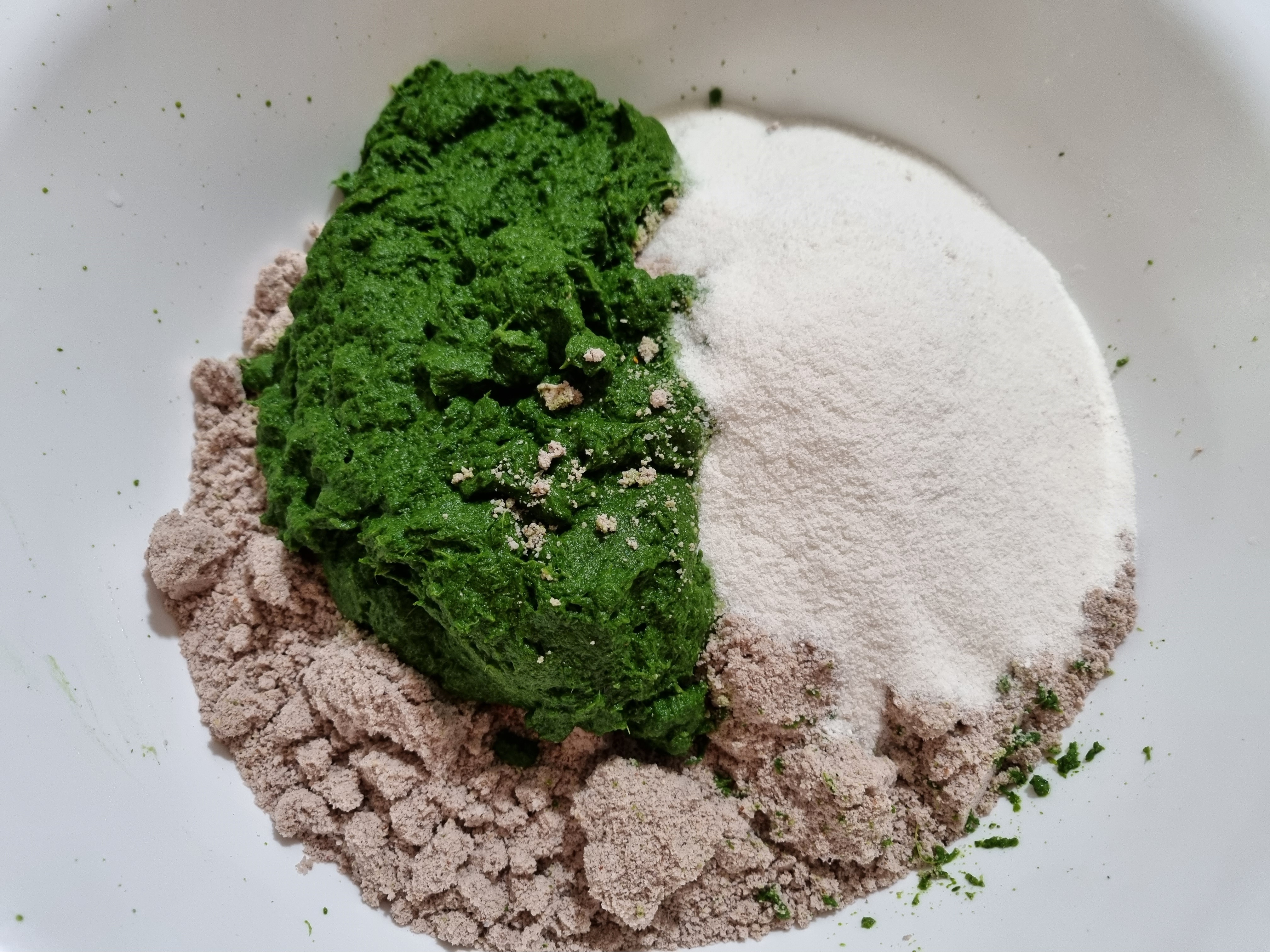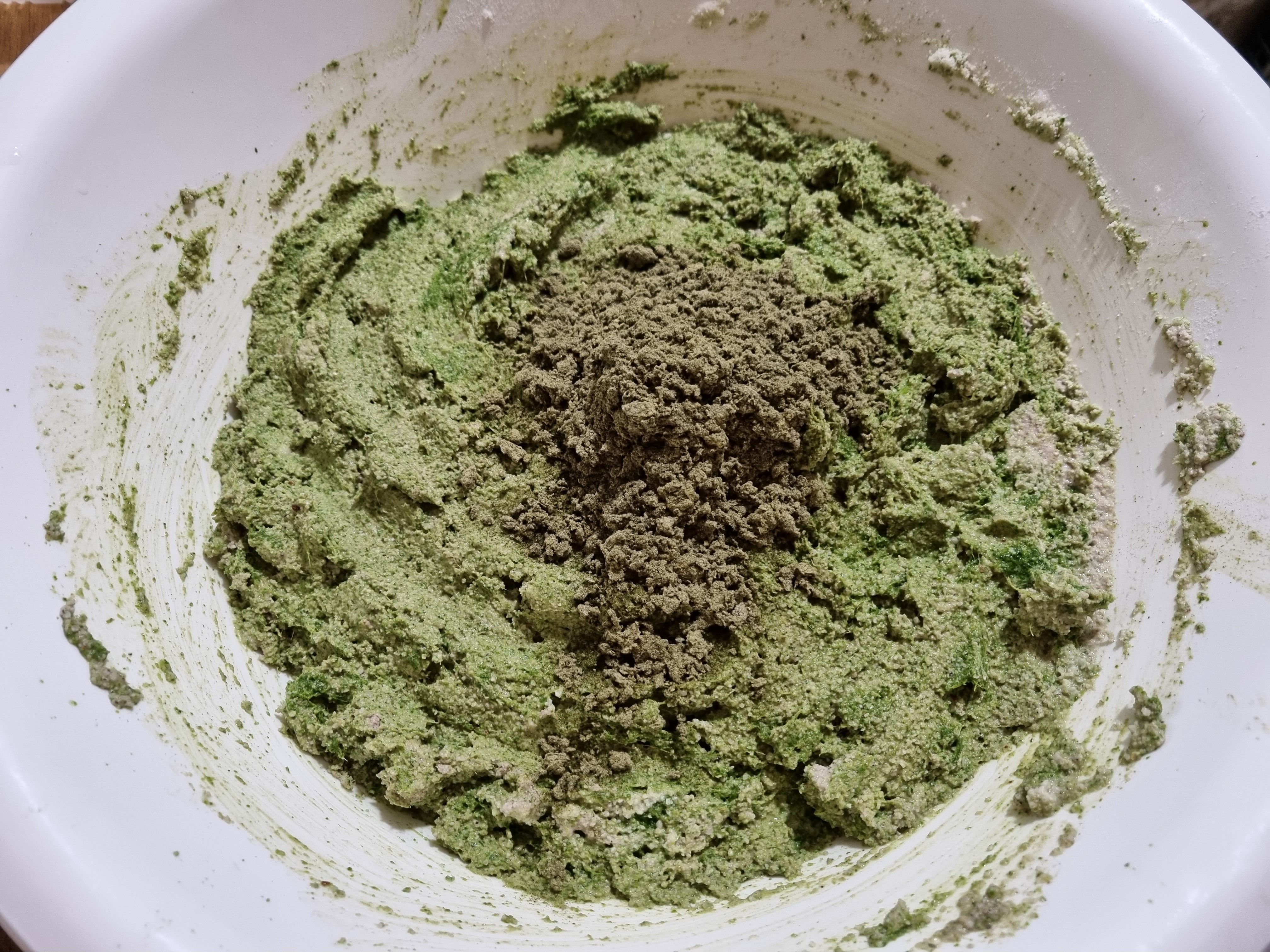 (반죽이 눅어 쑥가루 20g을 추가햐해 반죽을완성했다)