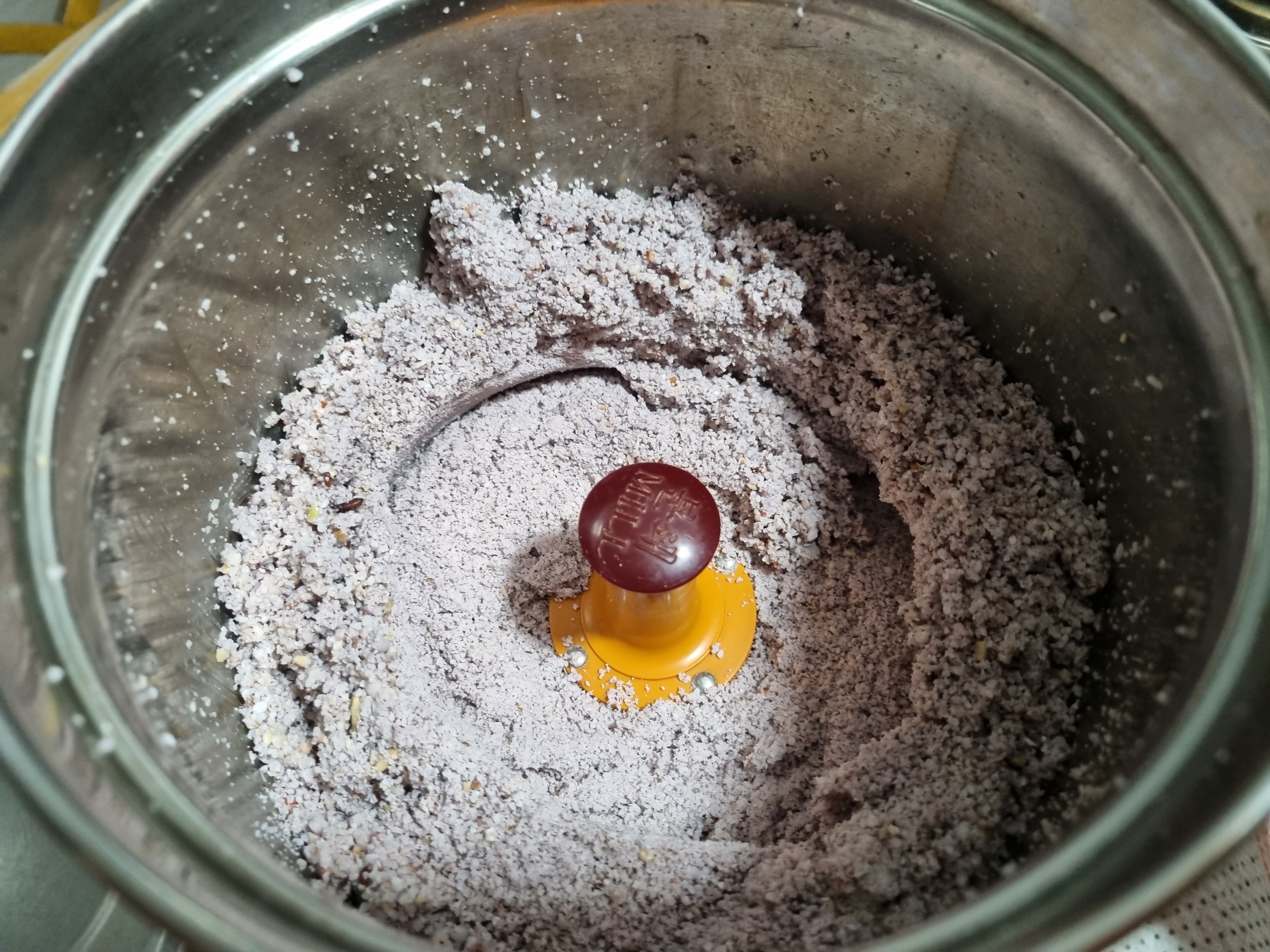 3) 불린 쌀(무게 1.2k가됐다)은 채반에 담아 물기 제거후 분쇄기에 간다 (물 조절을 위해 백미 2인분을 곱게 간다)