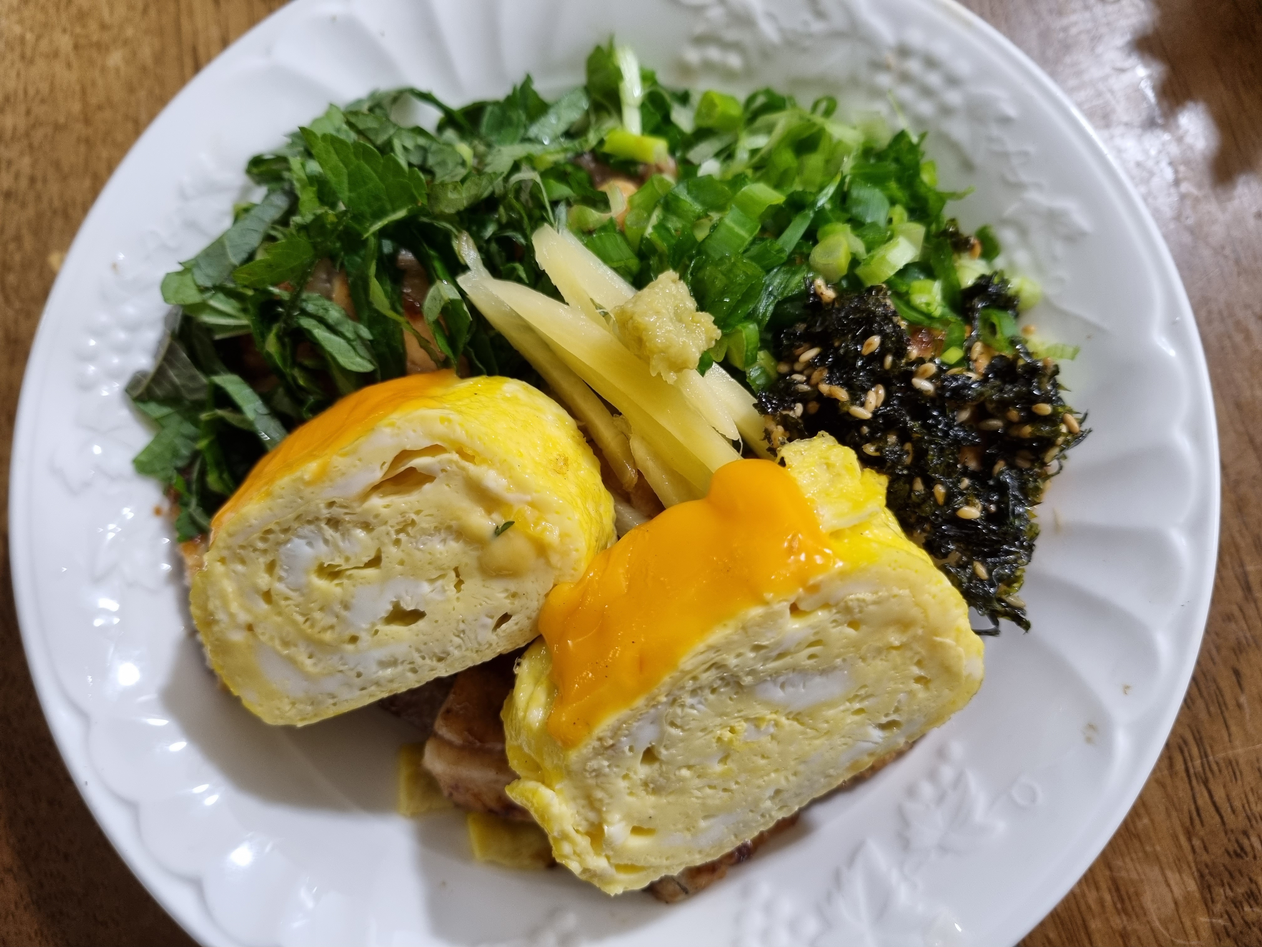 치즈 계란말이.생강채. 김자반. 와사비를 올려 완성했다