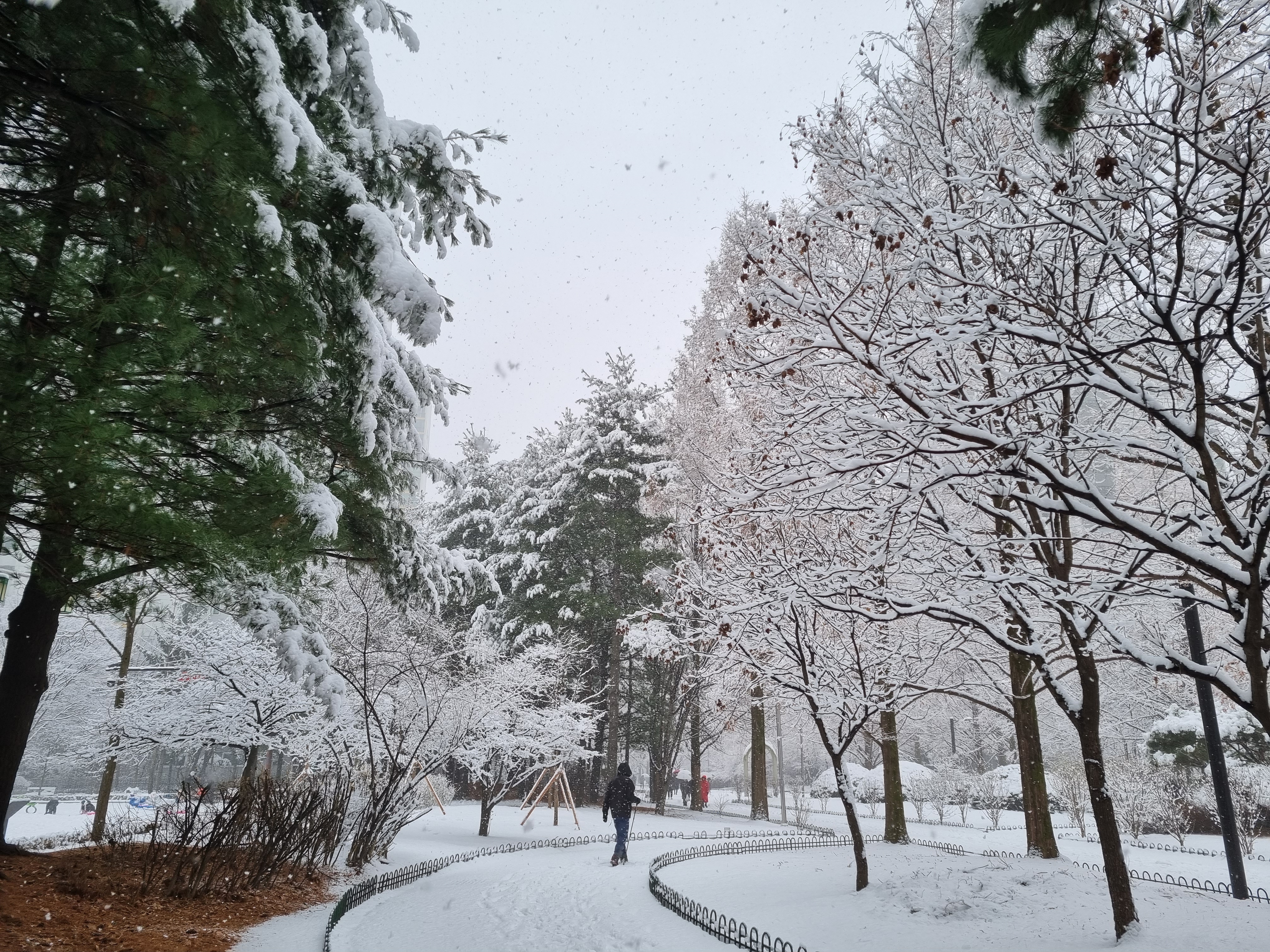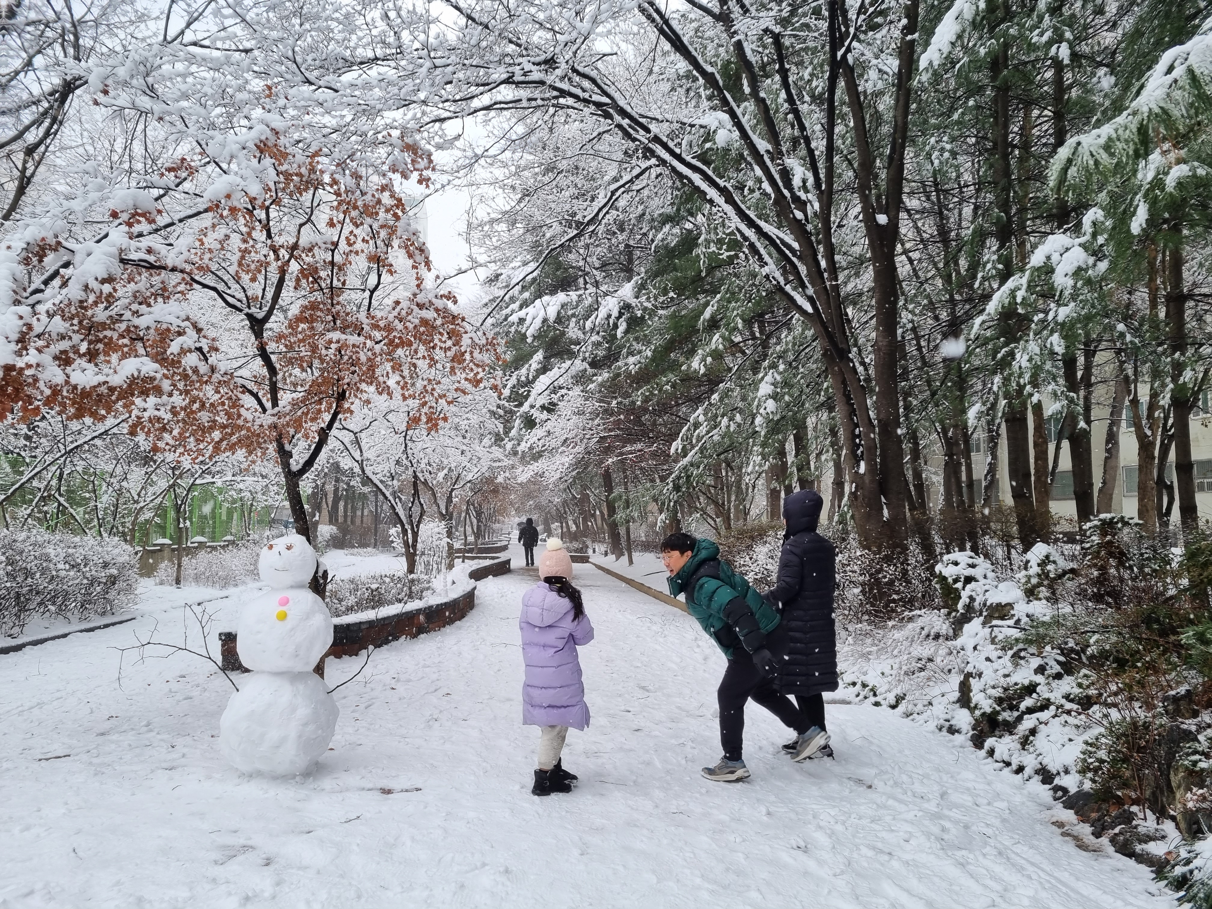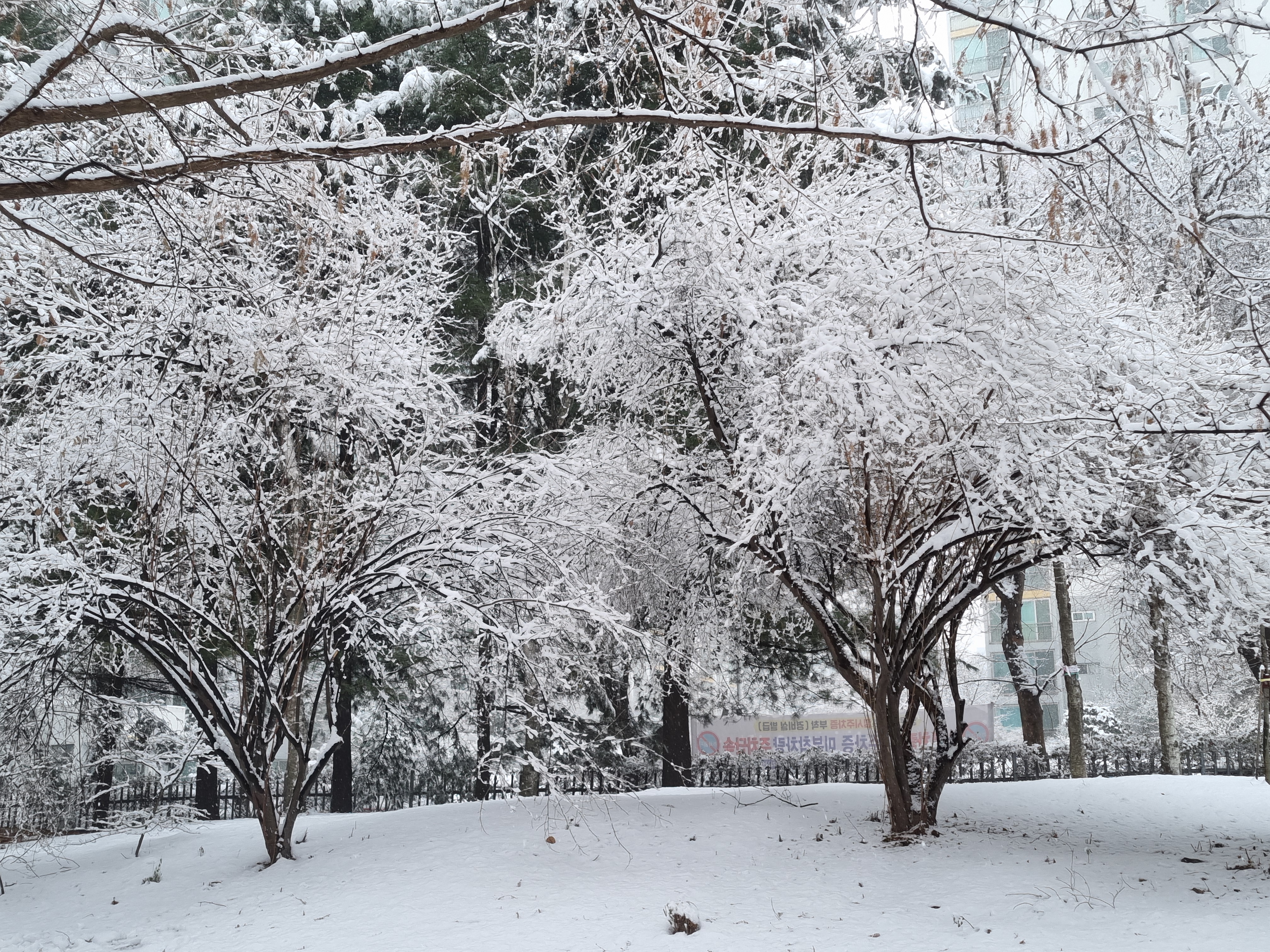 습설로 나무들이 축축 늘어지고 휴일을 맞은 아이들은