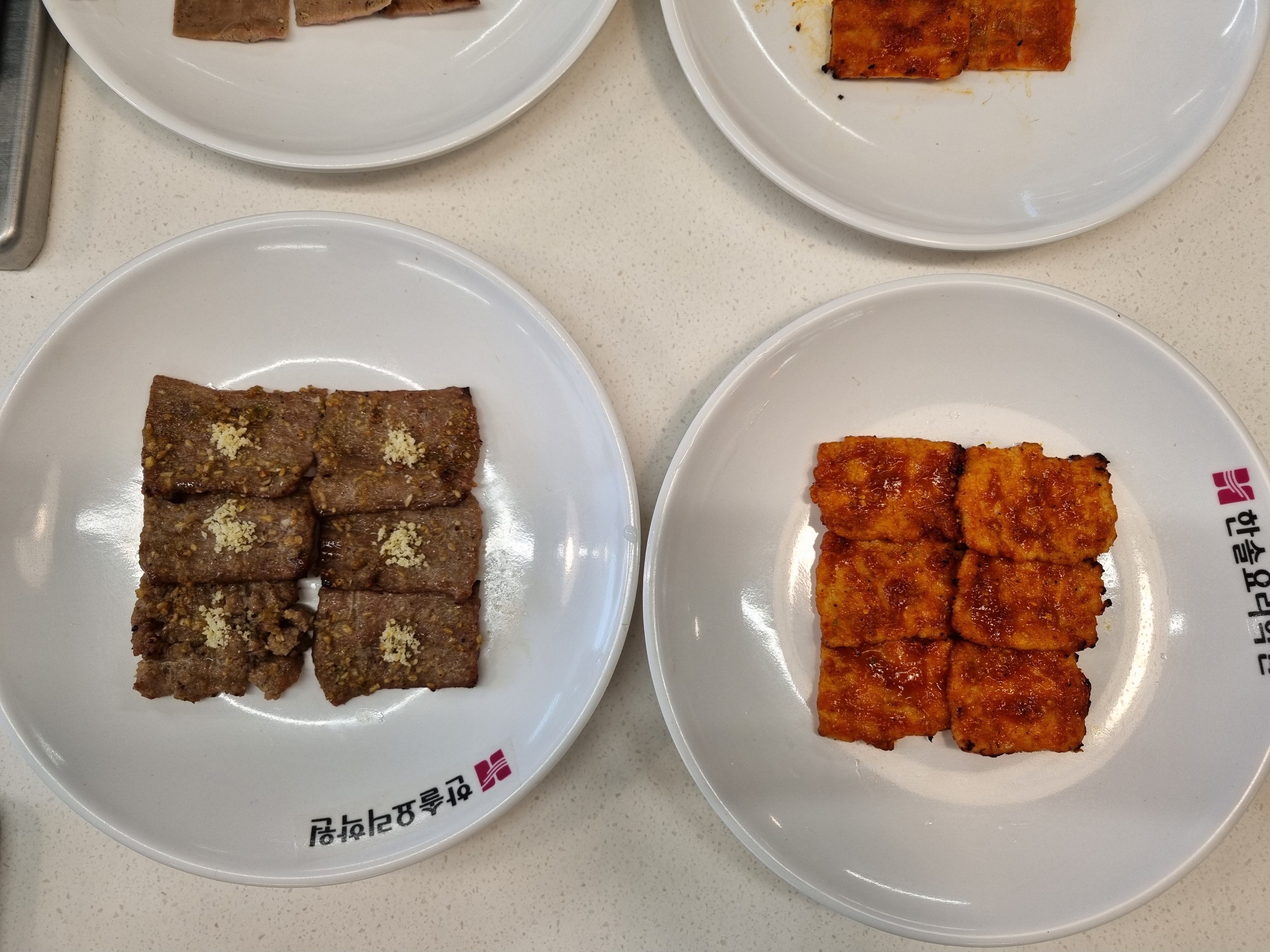 딱 담뱃갑 보다 작은소고기와 그 보다 쬐끔은 큰 돼지고기 한덩이씩 배당 받아 포 떠 석쇠 구이를 만들어 내는거다