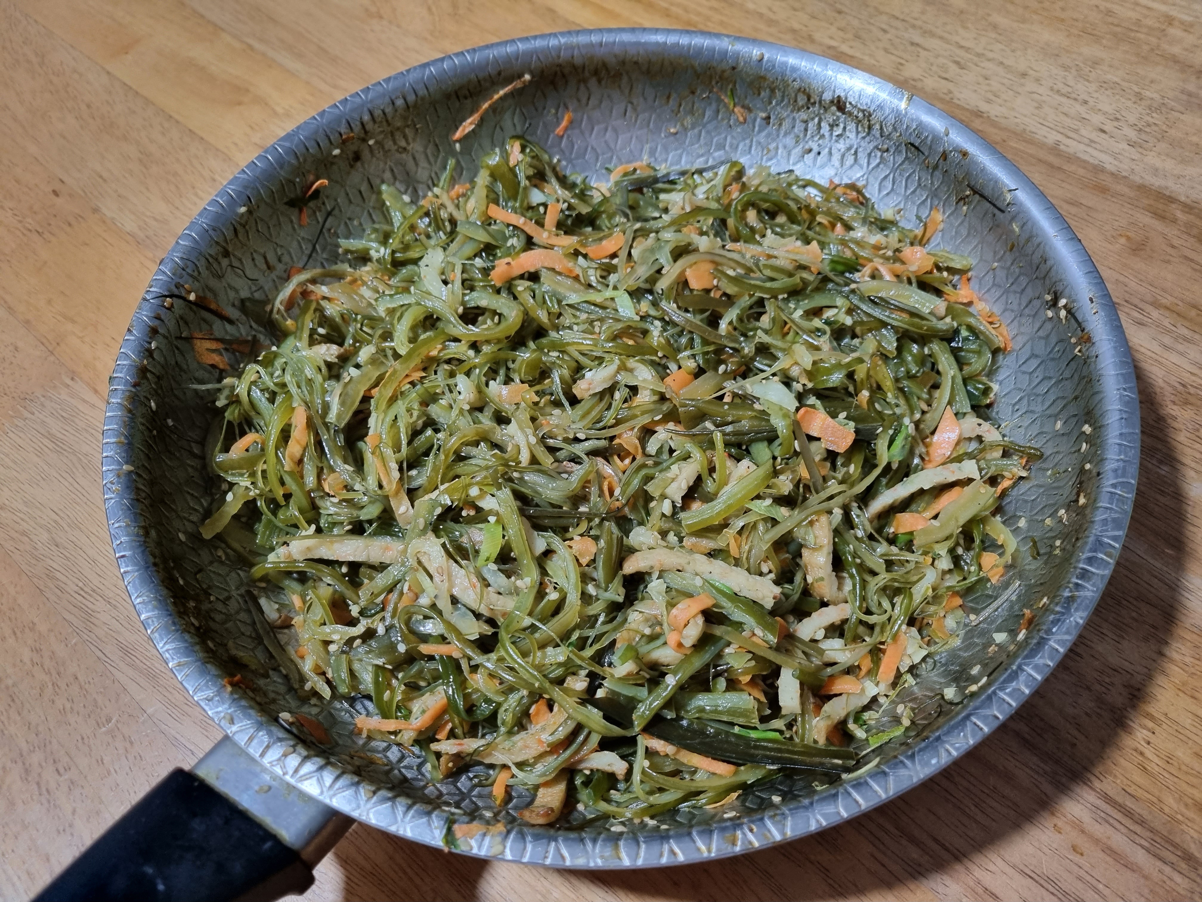 미역 줄기를 후라이팬에 넣고 간장. 액젓. 미림 넣고 볶다가 당근. 어묵. 양파. 물엿 을 넣고 볶는다