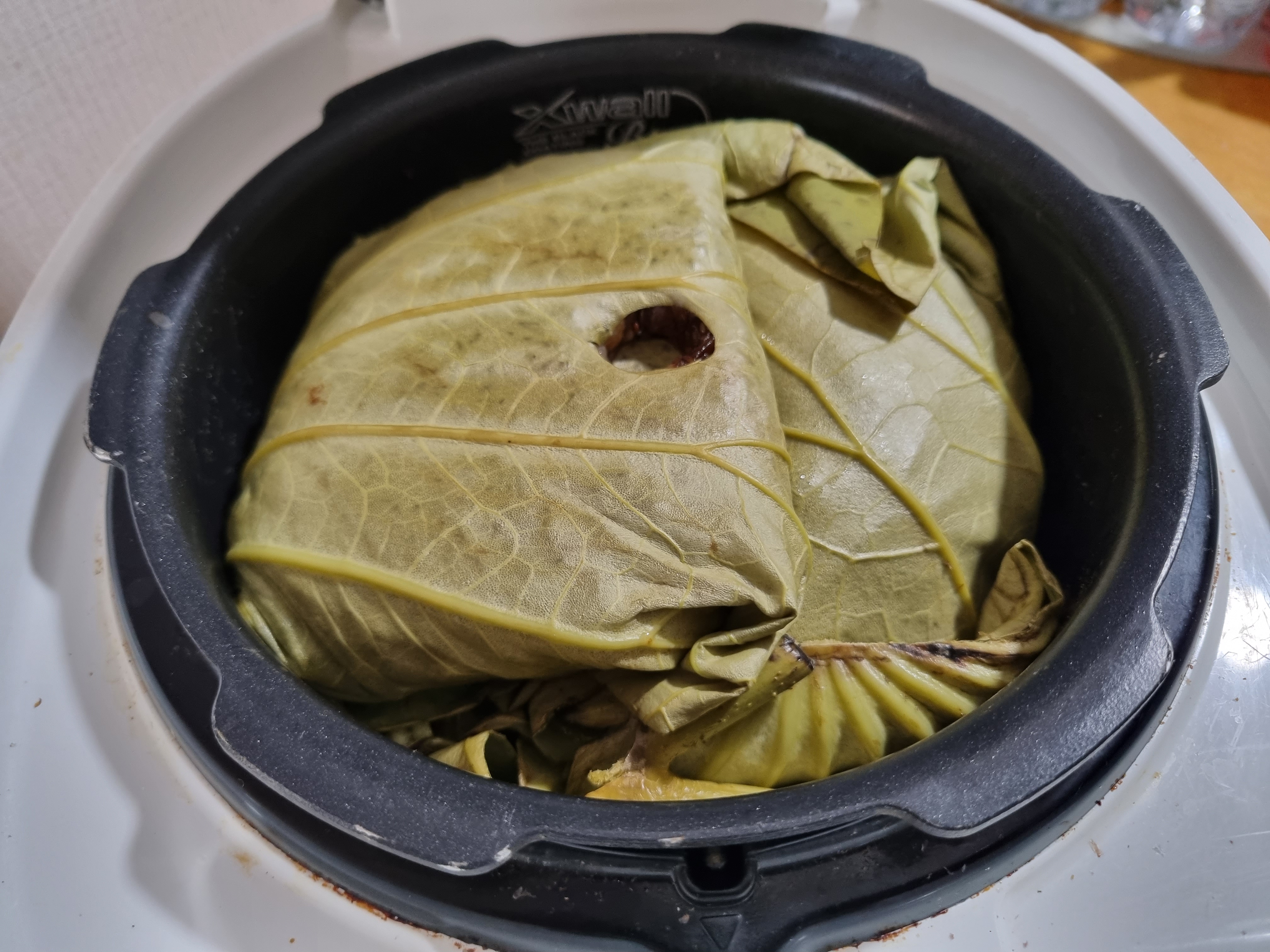 밥을 싸서 전기밥 솥에 재가열 버튼을 눌러 간단하게 연잎밥을 만들었다