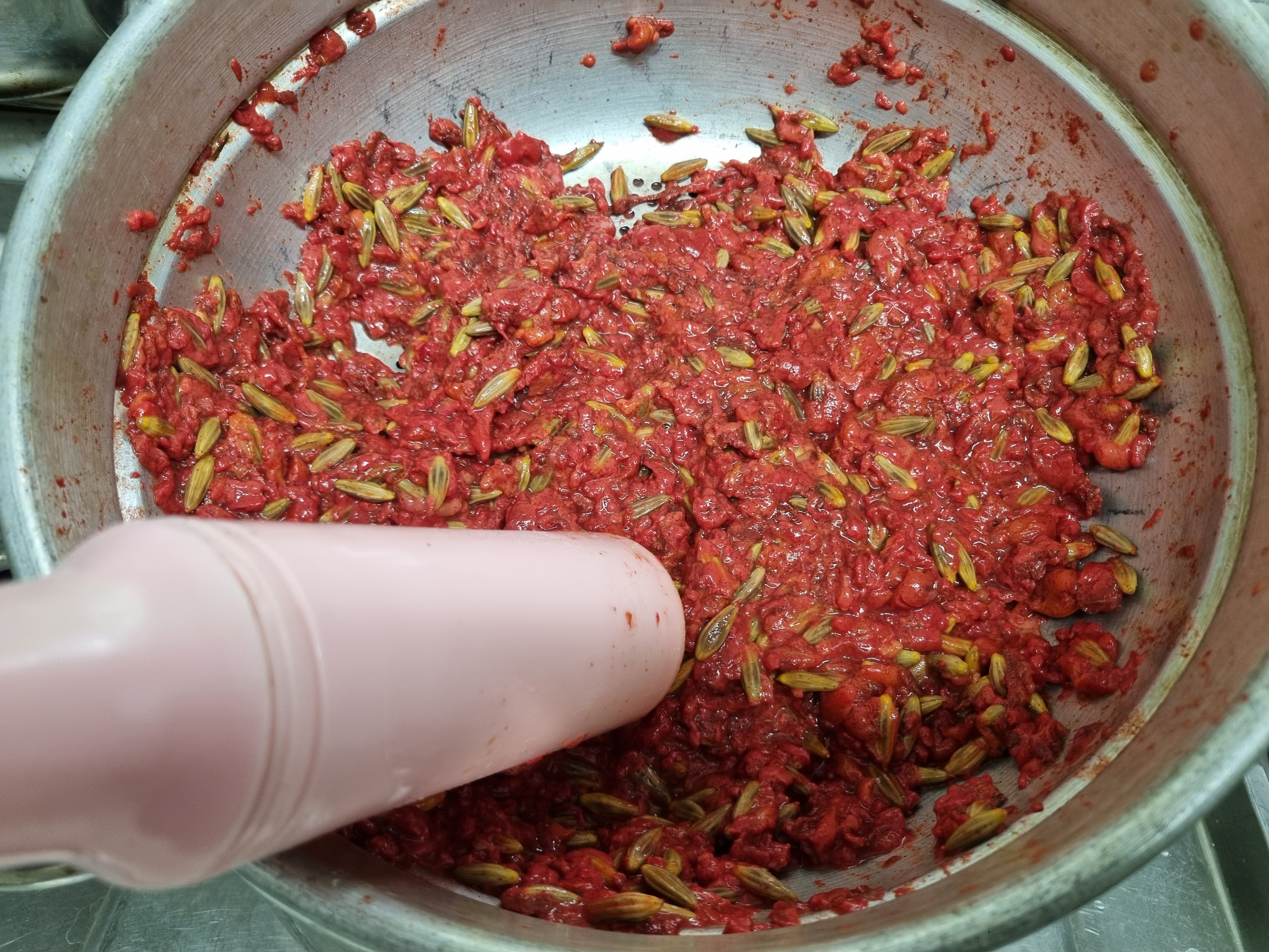 채반에 쏟아 씨앗 분리를 위해 방망이로 으깬다