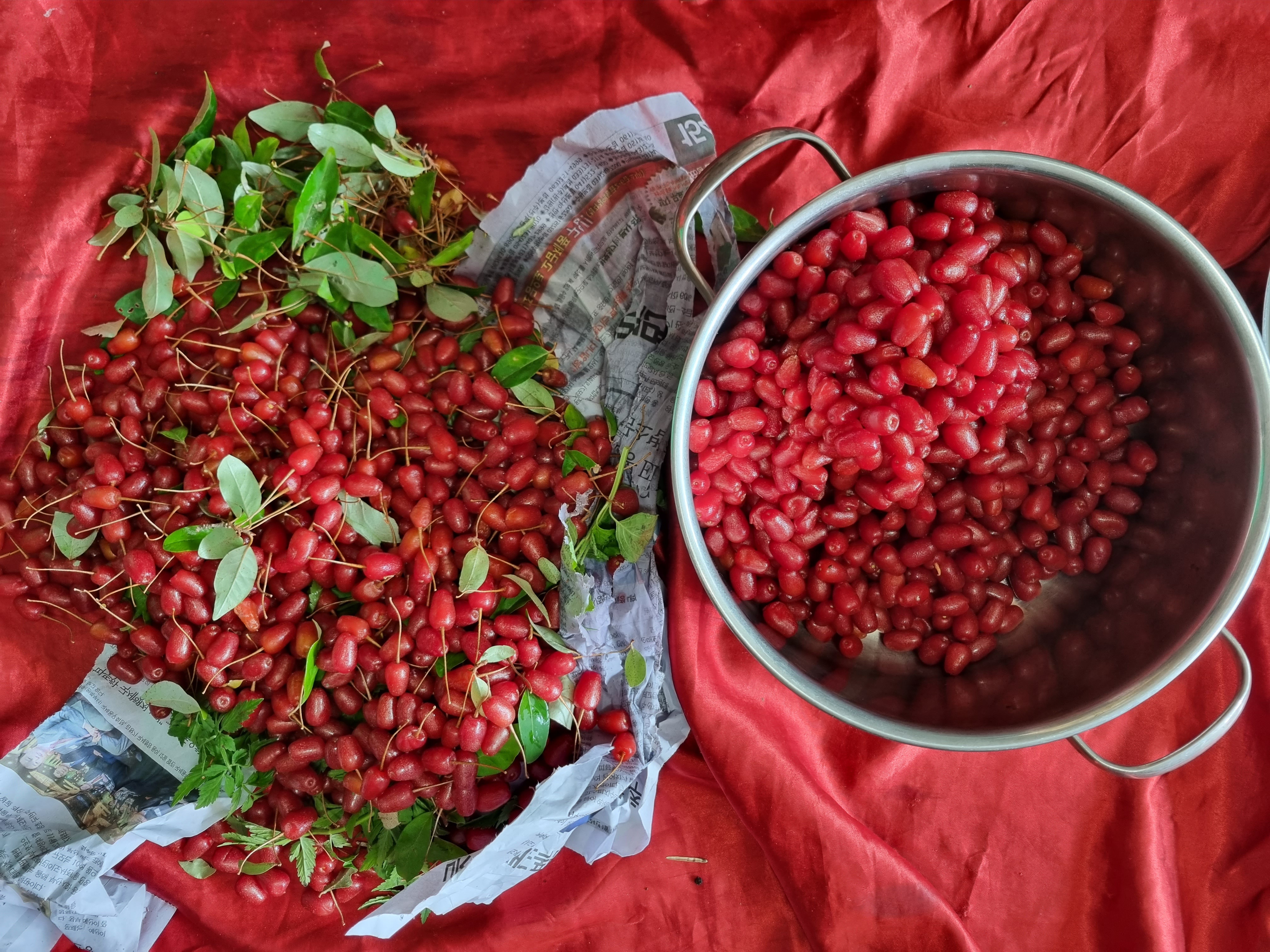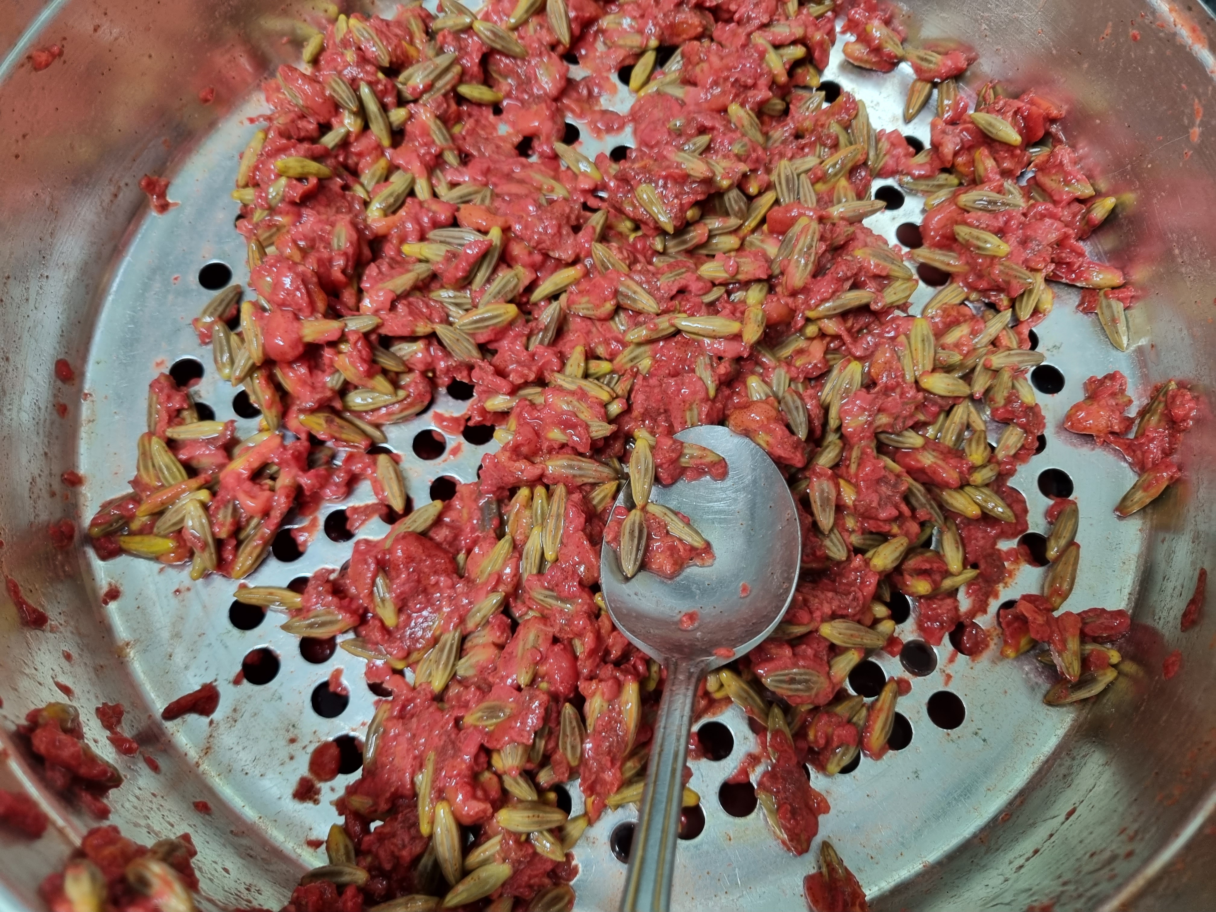 씨앗. 과육을 베 보자기에 꼭 짜 즙을 낸다
