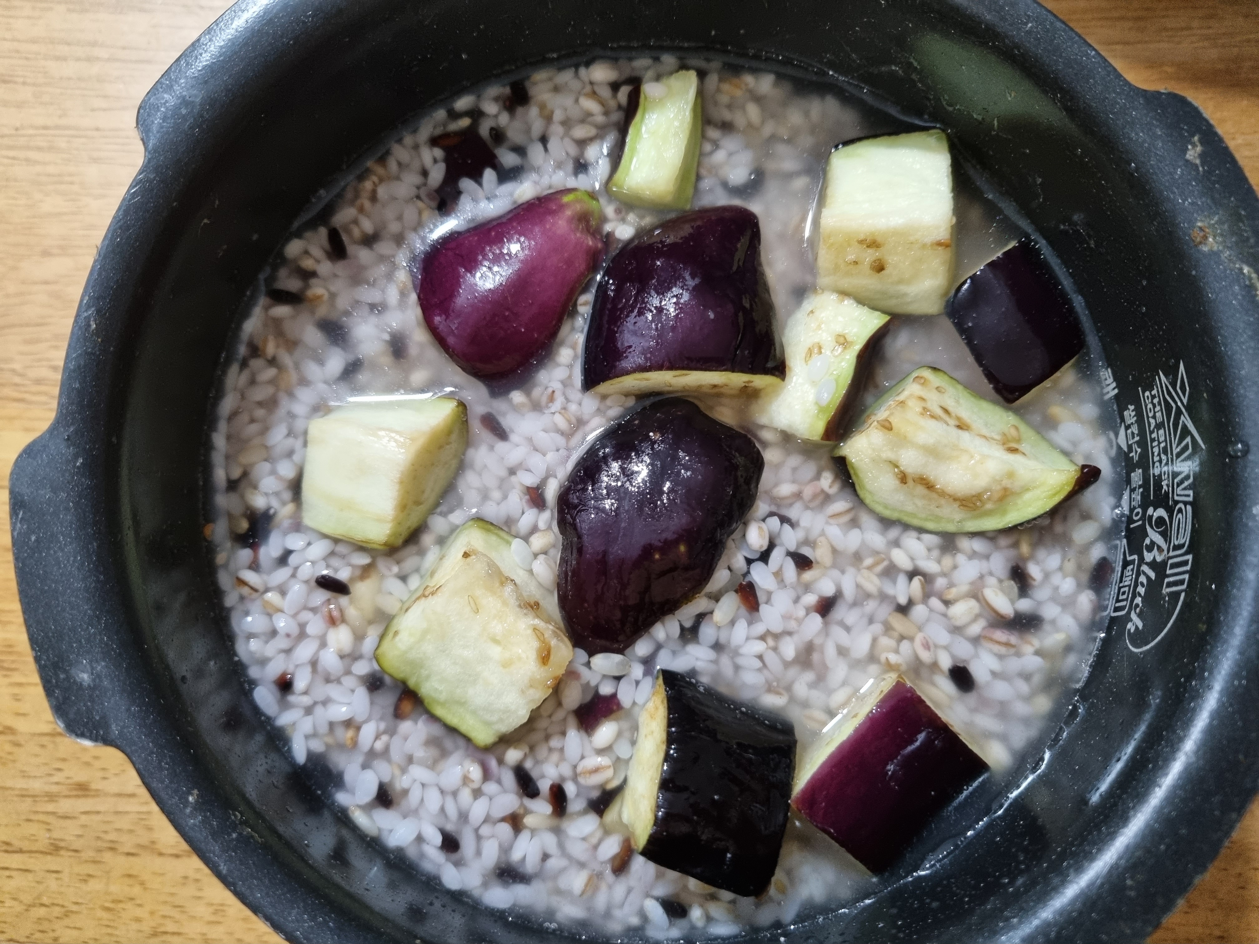그중 몇개 썰어 갈은 돼지고기랑 찹쌀을 넉넉히 섞은 잡곡을 섞어 밥을합니다