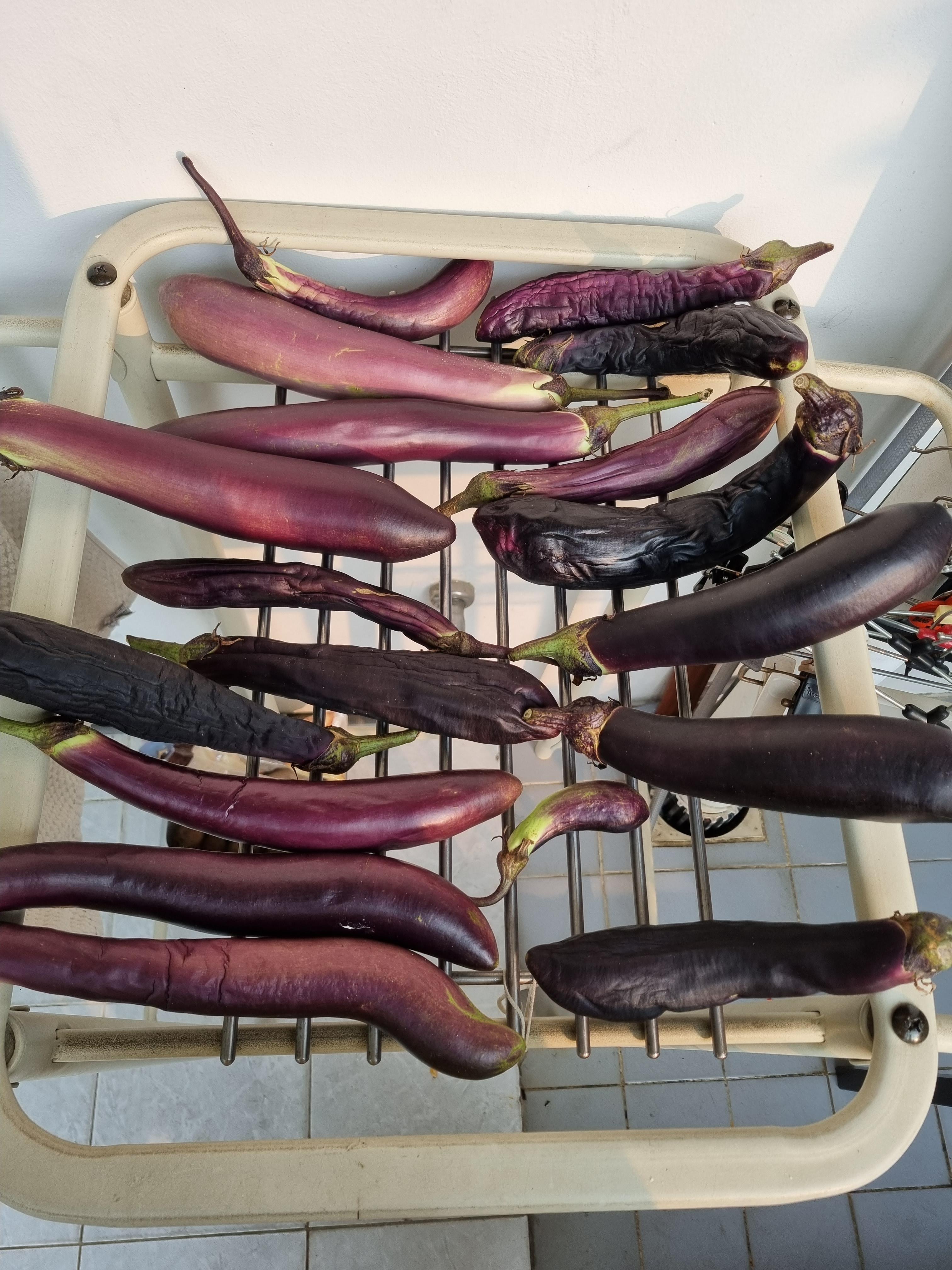 (보랏빛이 도는 가지는 밭에서 따 온 가지. 짙은 색 가지는 천윈에 3개 파는 걸 사 날랐다