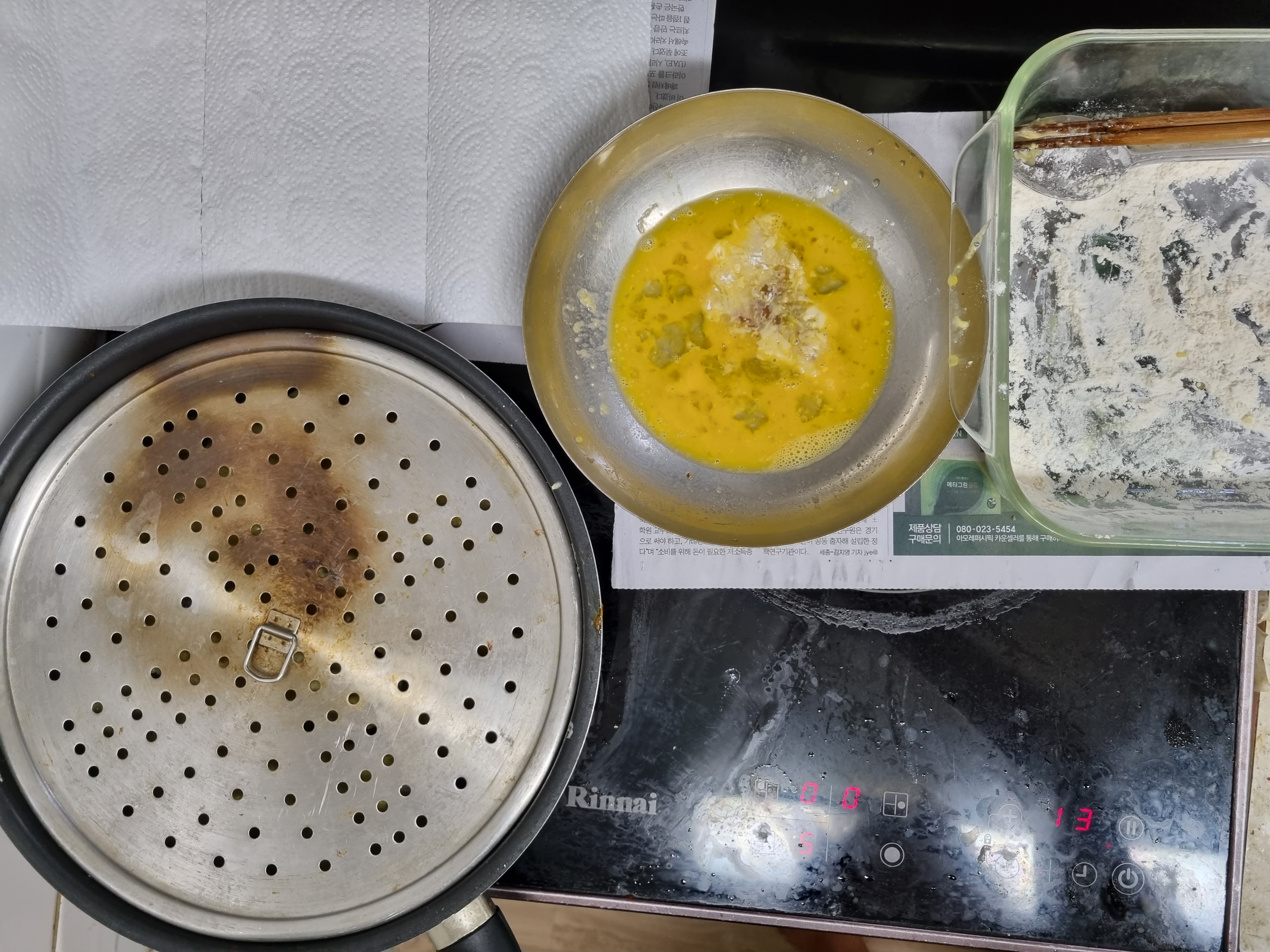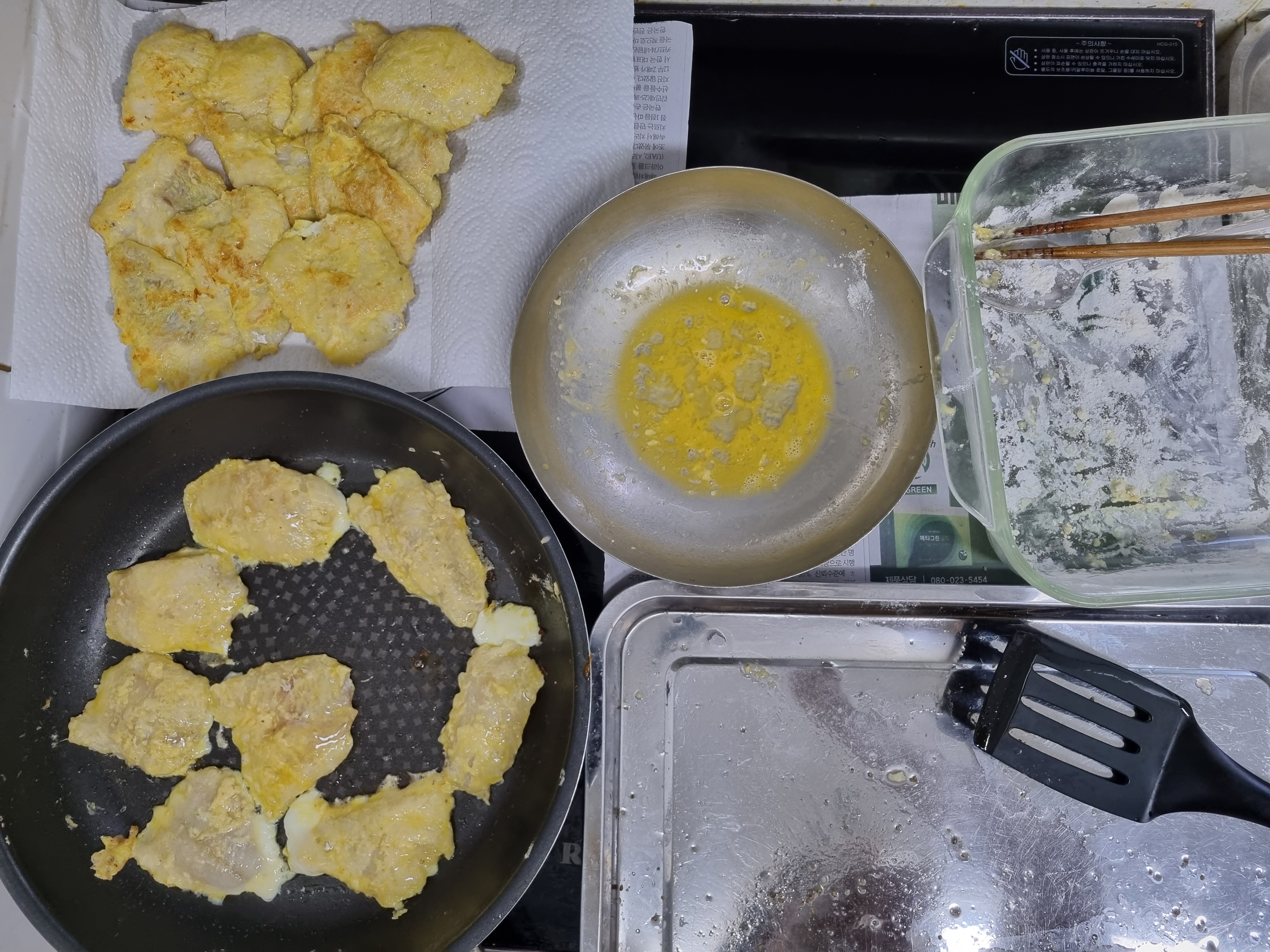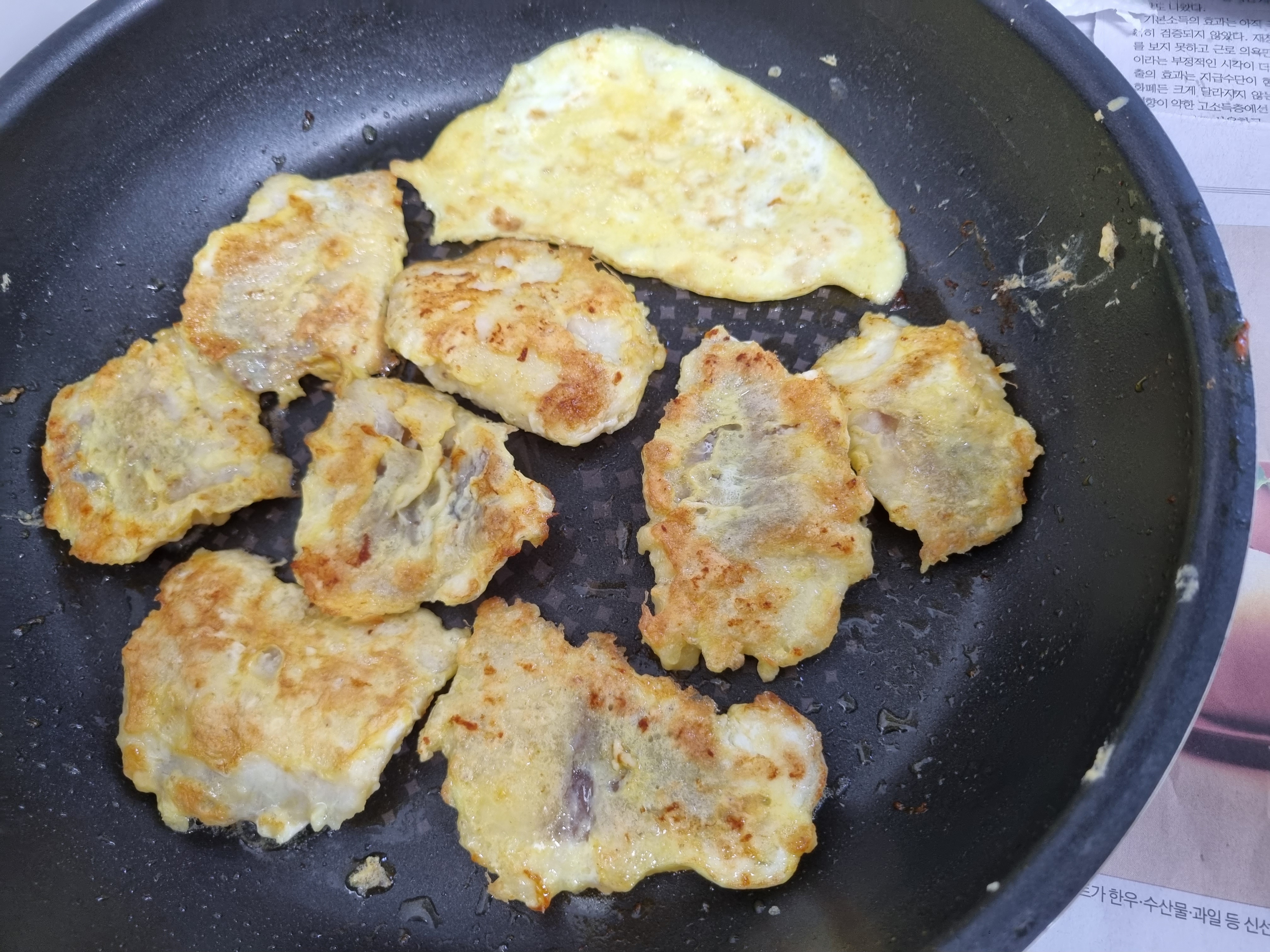 부침가루를 묻혀 달걀 물을 적셔 팬에 올려 지져낸다