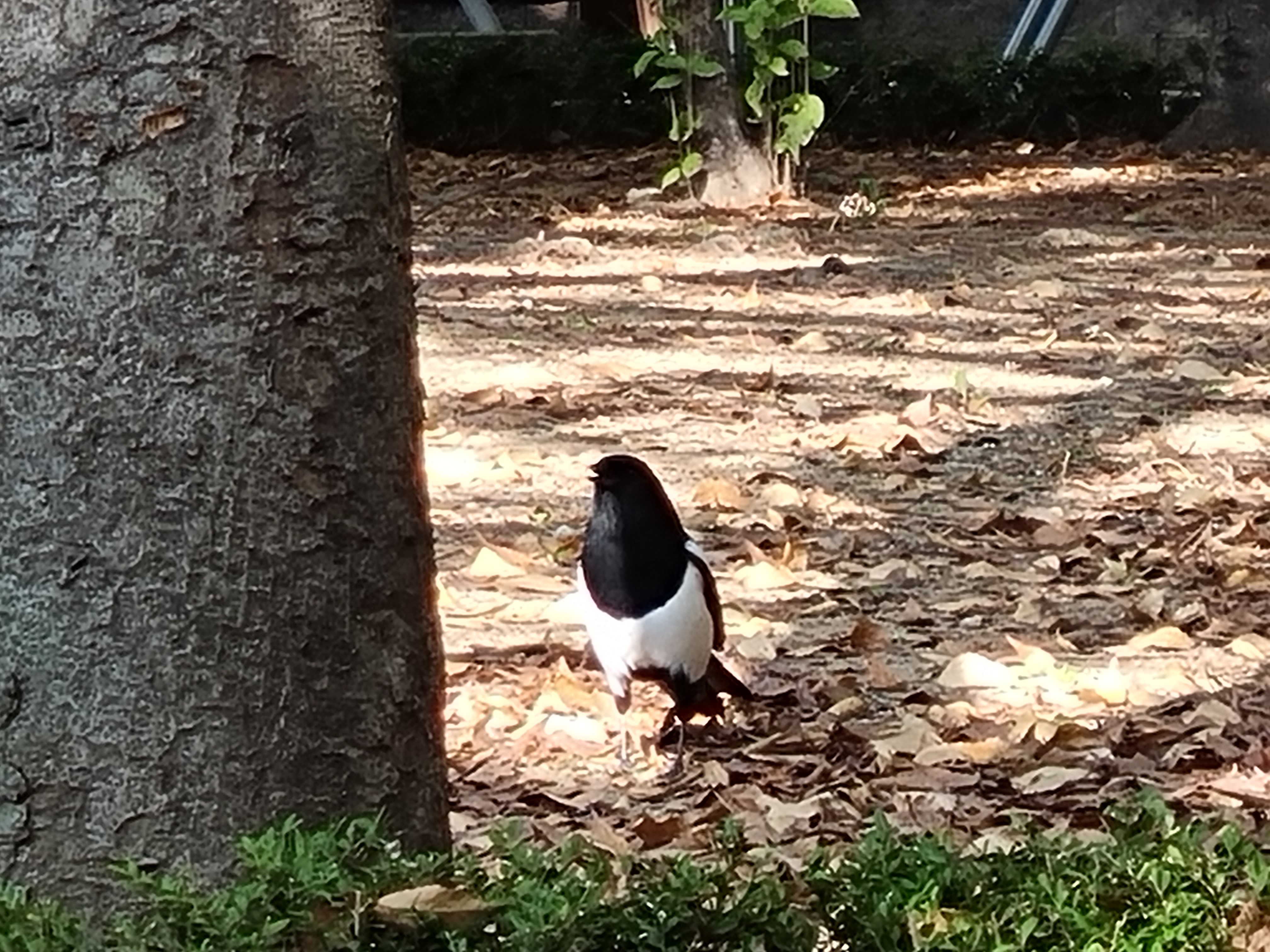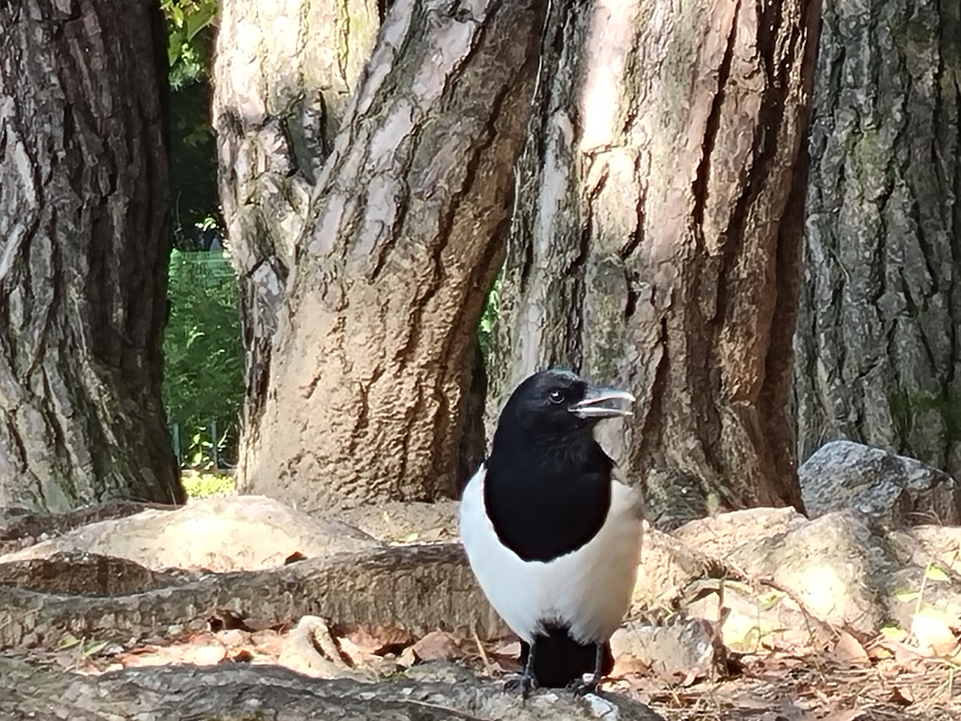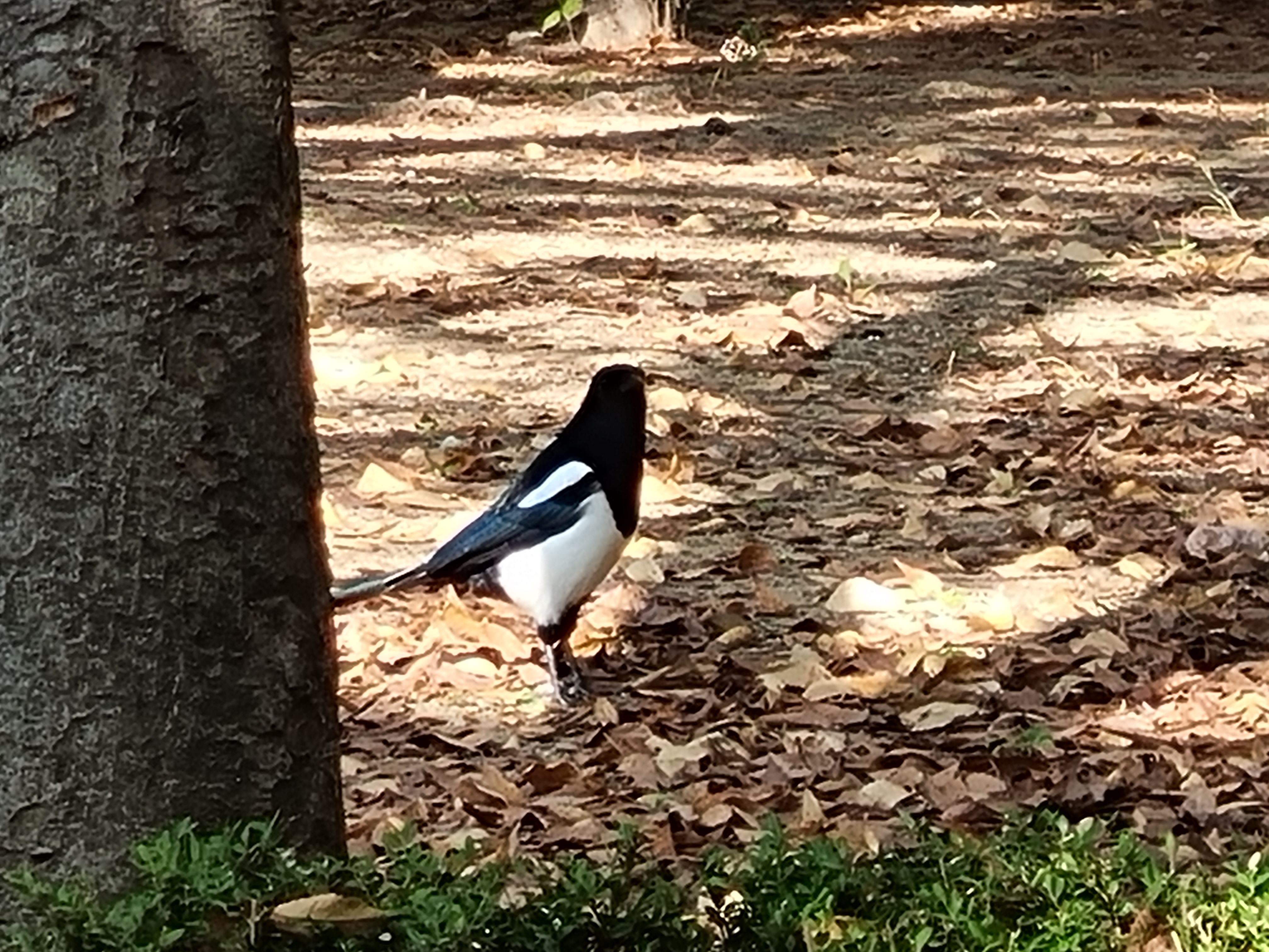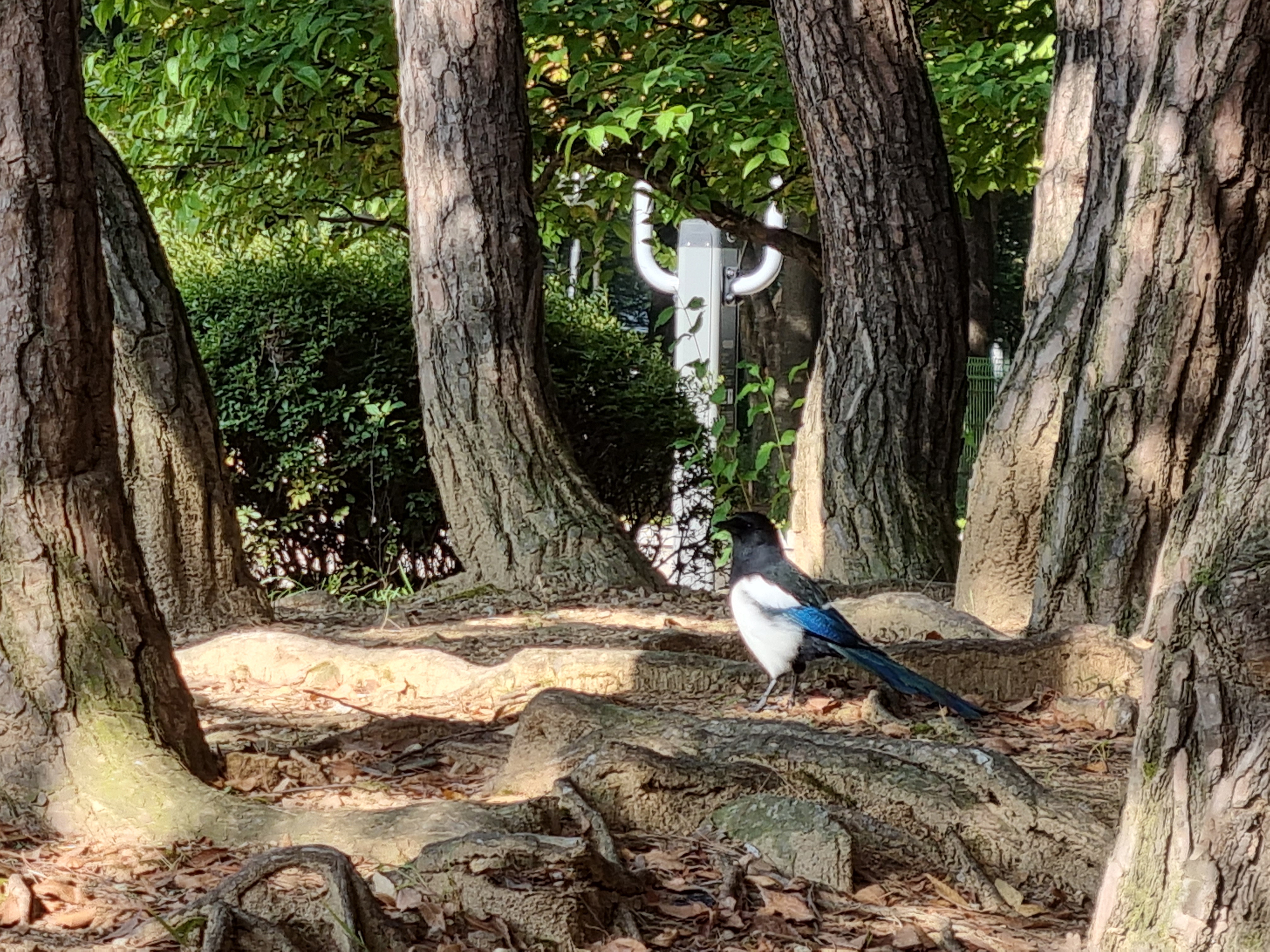 솔 숲 아래 범상치 않게 눈에 띄는 까치 한마리를 만났다