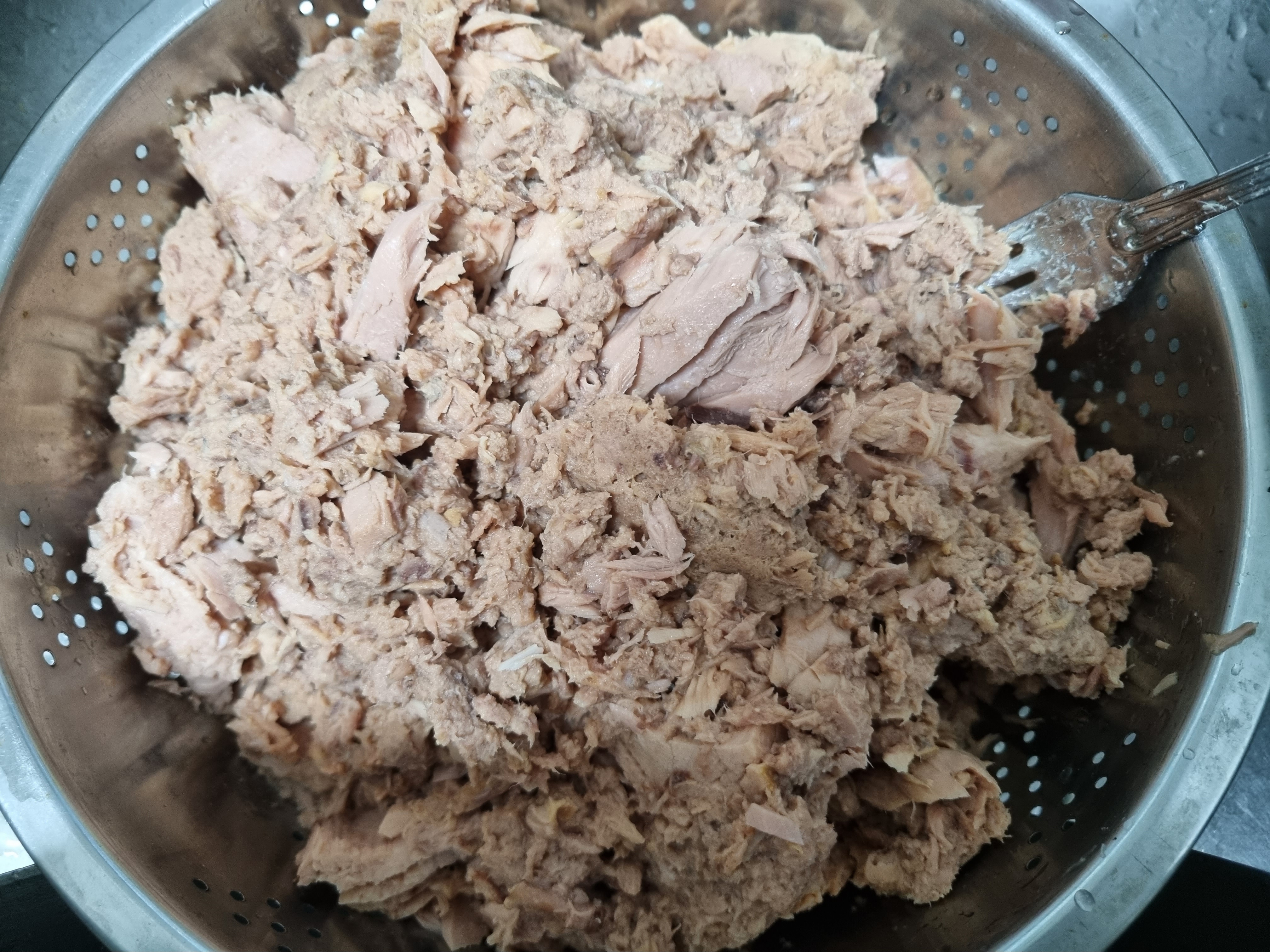 참치 대형 캔 1통 채반에 쏟아 육즙을 빼는 중 ~