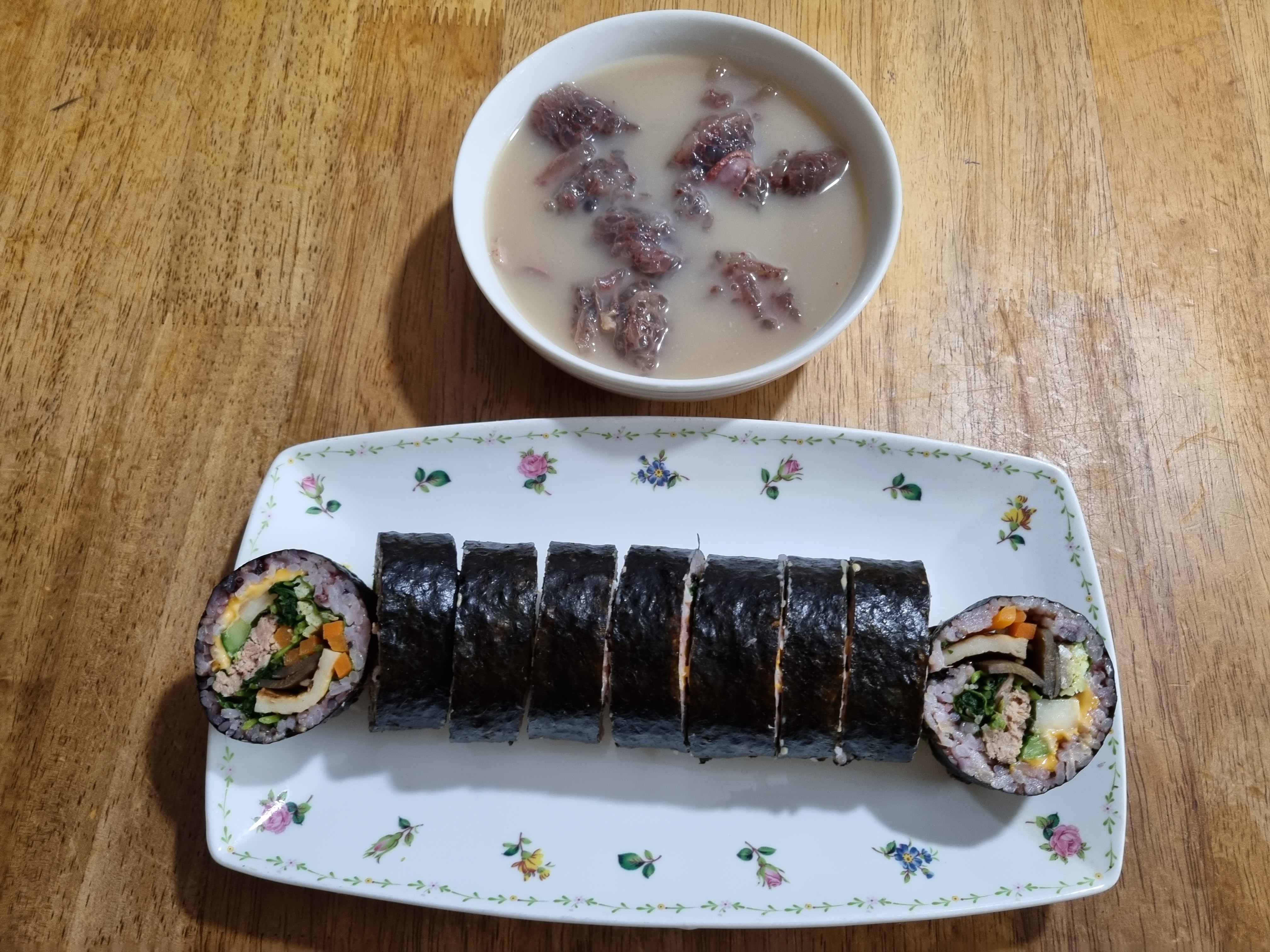 참치 김밥과 시판 진주 포차 순대만 썰어 넘고 끓인 순대국 조합