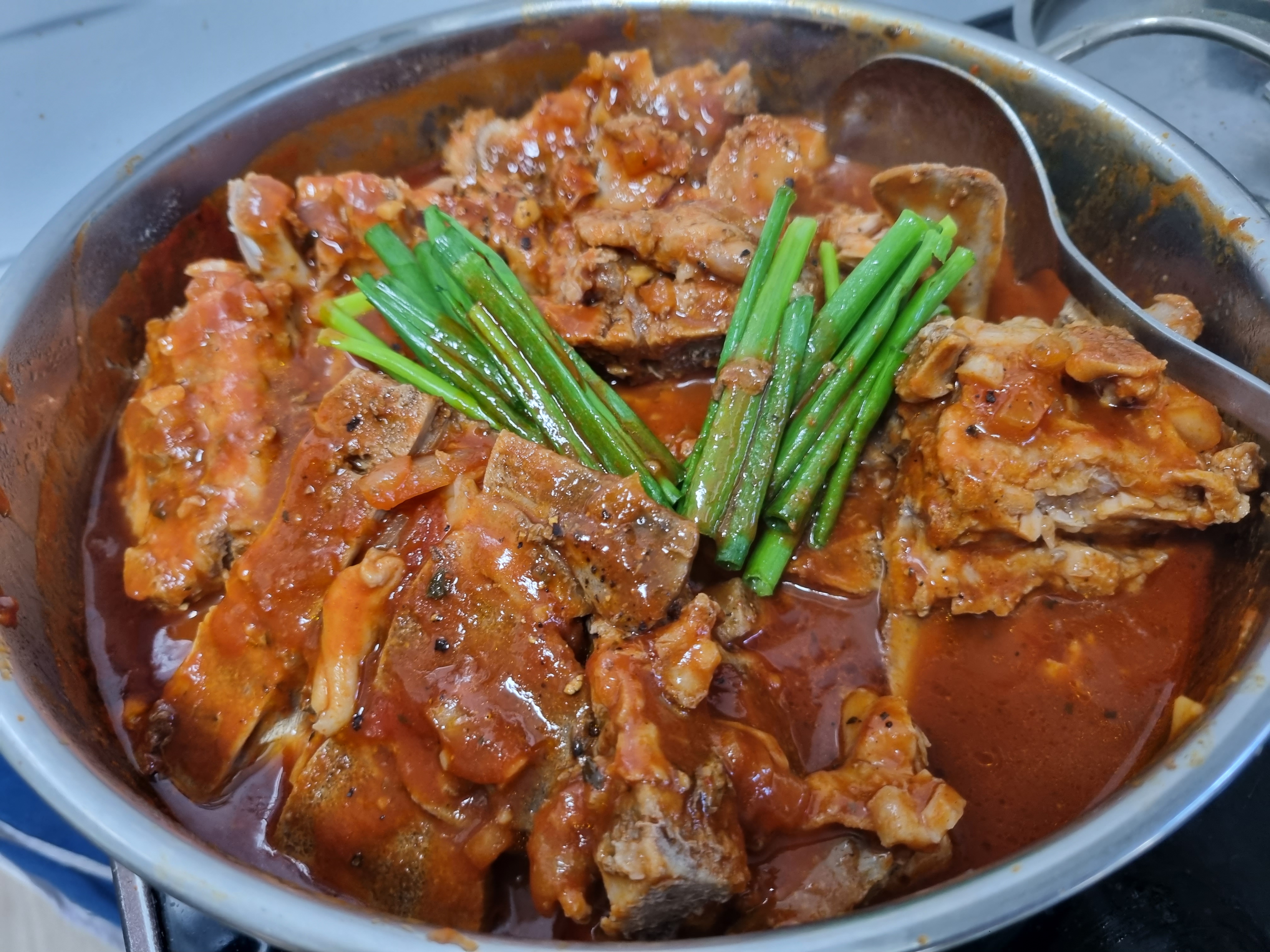 돼지 등뼈를 넣고 섞어 잠깐 끓이다 마지막에 후추를 넣고 마무리했다