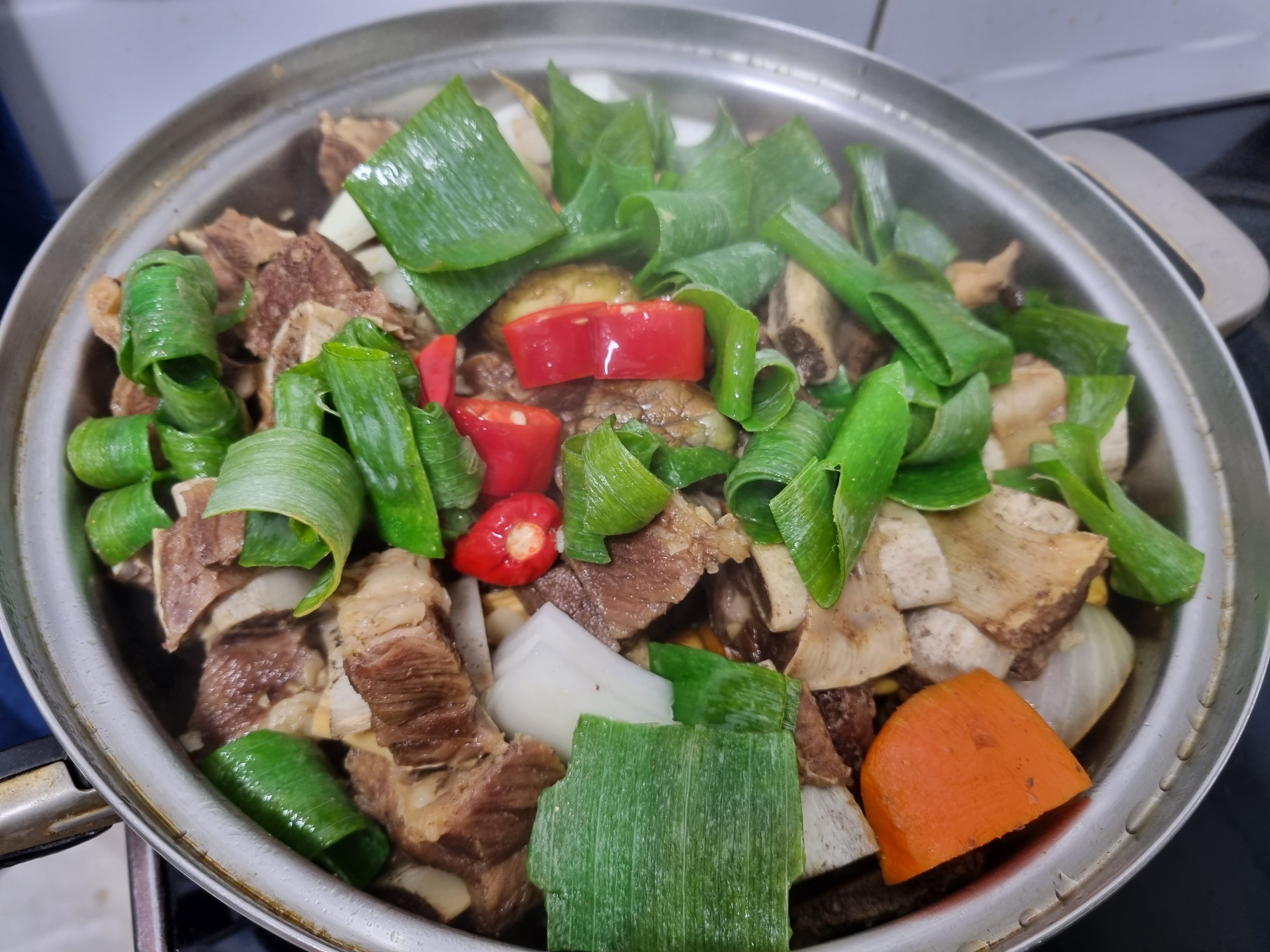 갈비를 넣고 가지. 밤. 양파. 대파. 홍고추 를 넣고 고루 저어가며 익힌다