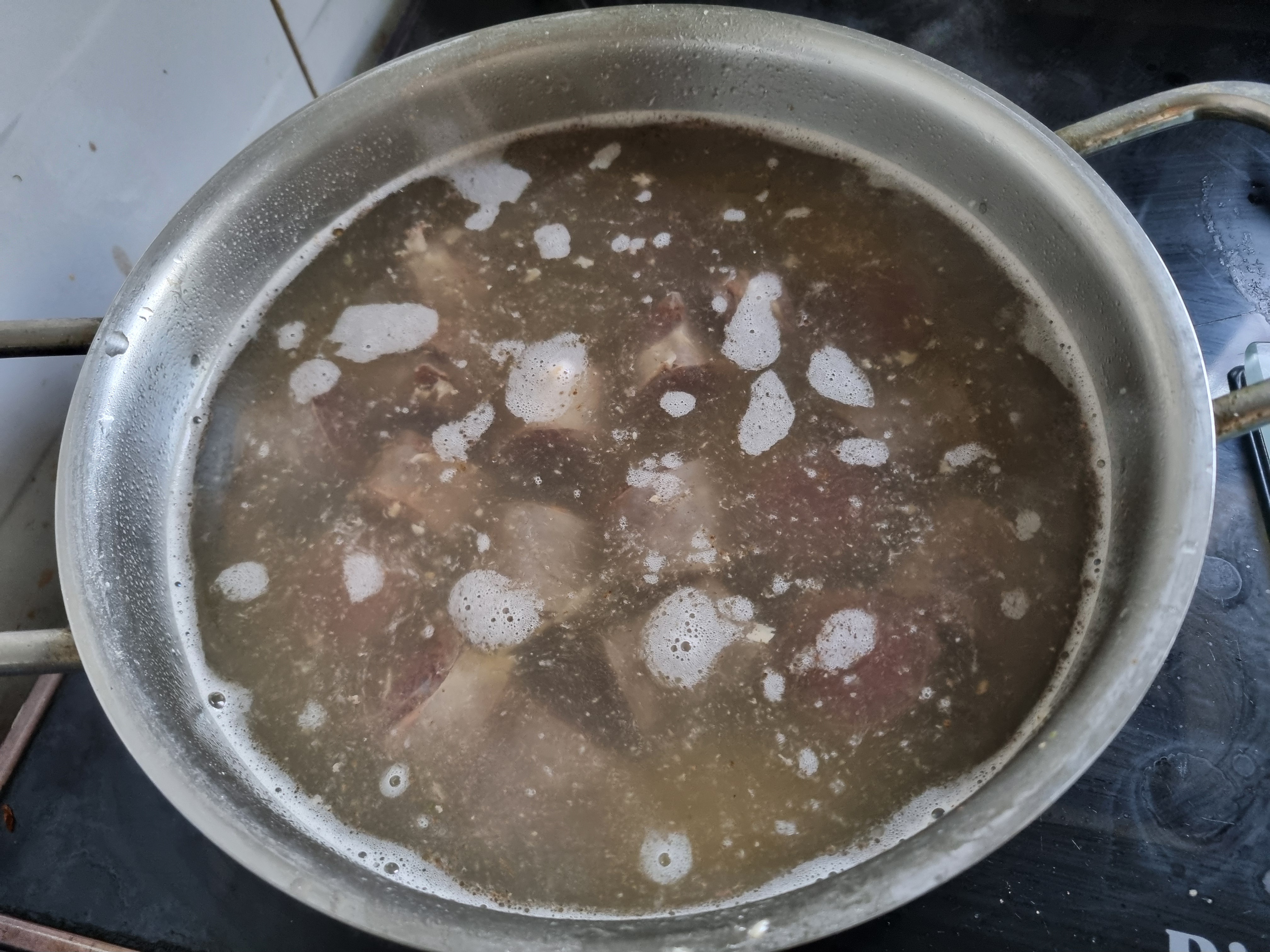 돼지고기 삶을 물은 식혀 위에 굳은 기름을 걷어냅니다