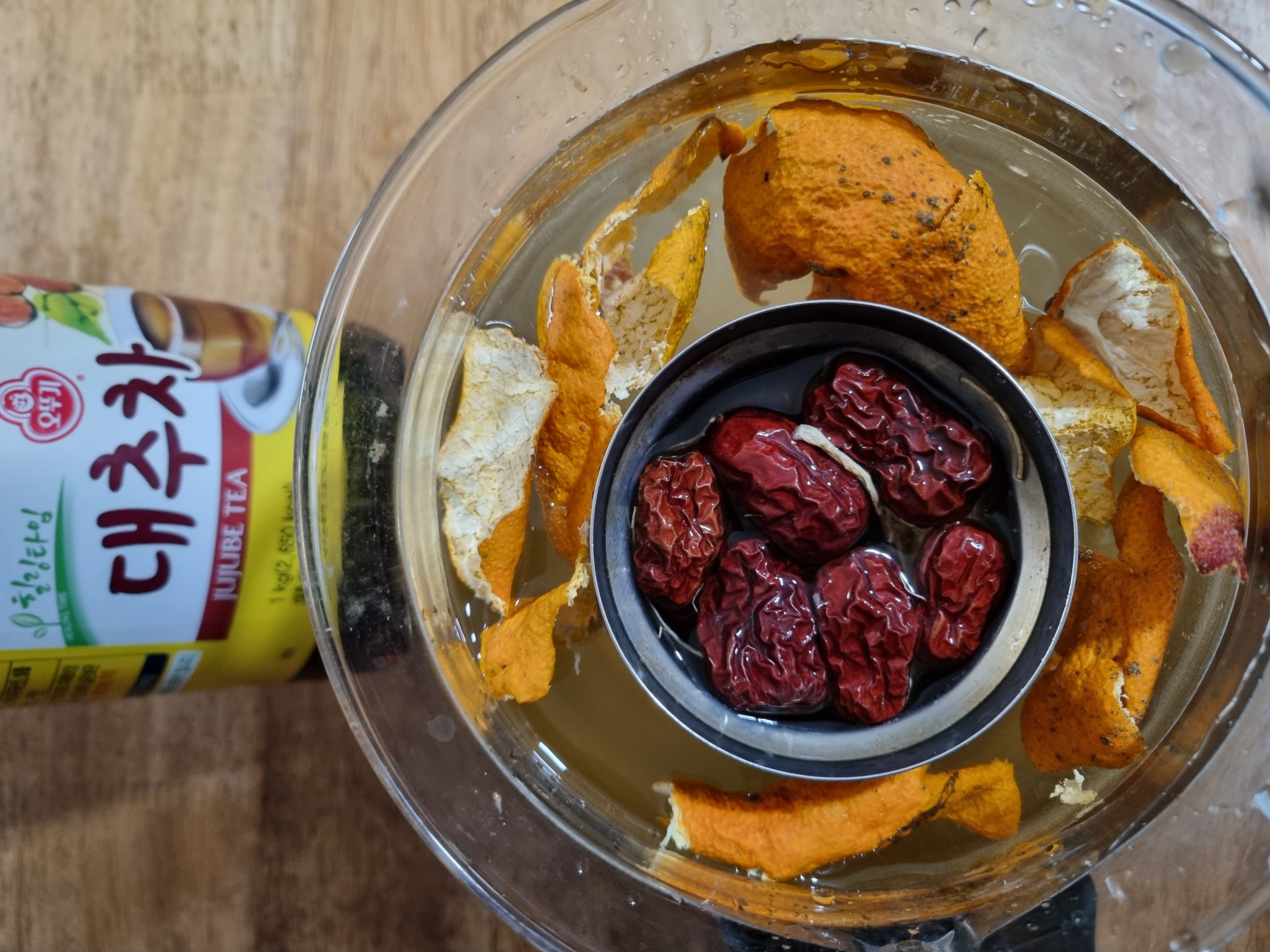 유기농 건 귤껍질 2개분. 건 도라지 잔뿌리. 대추6~7개.