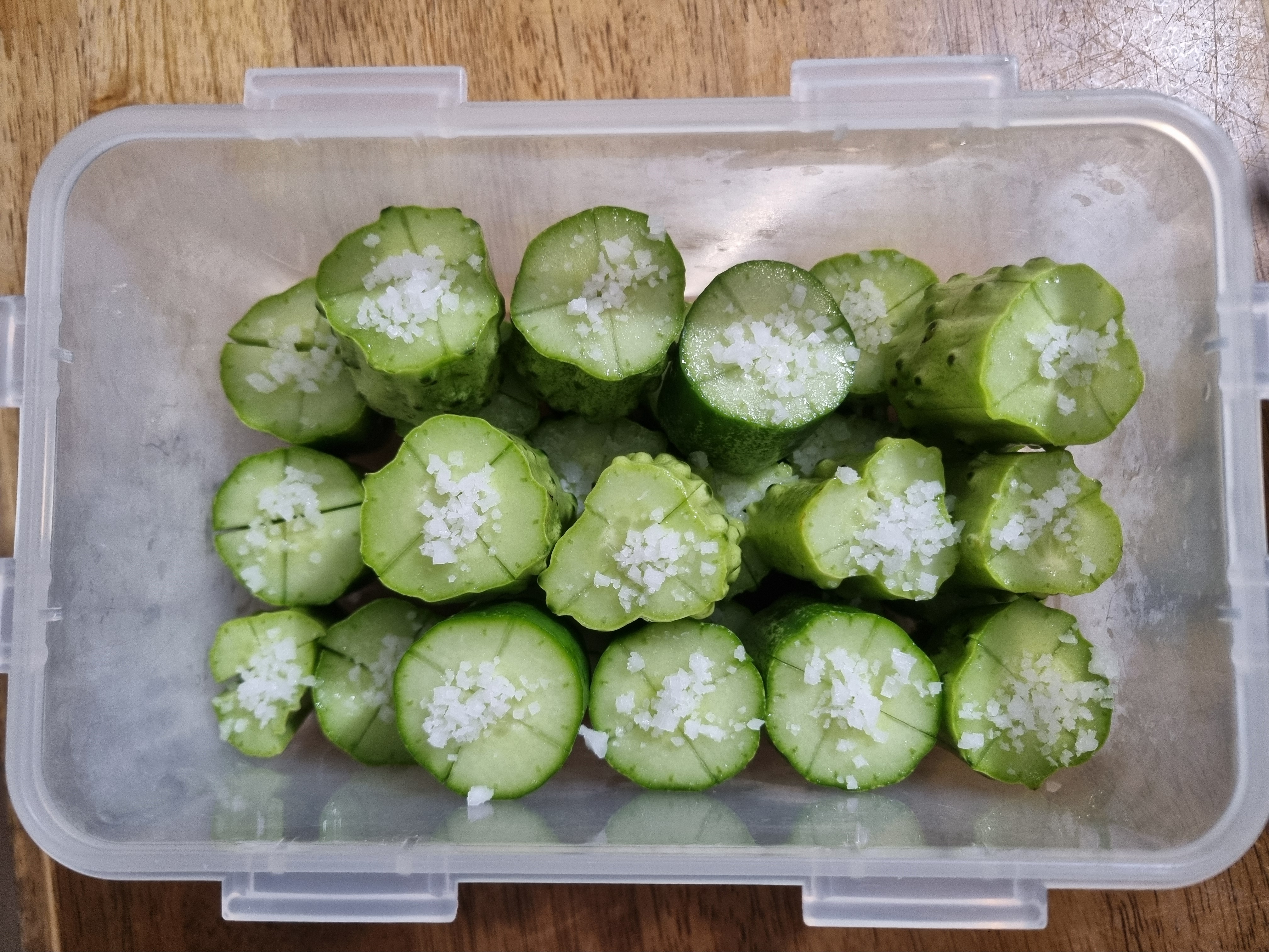 오이도 소금에 절였다 채반에 쏟아 내 소금물을 빼고