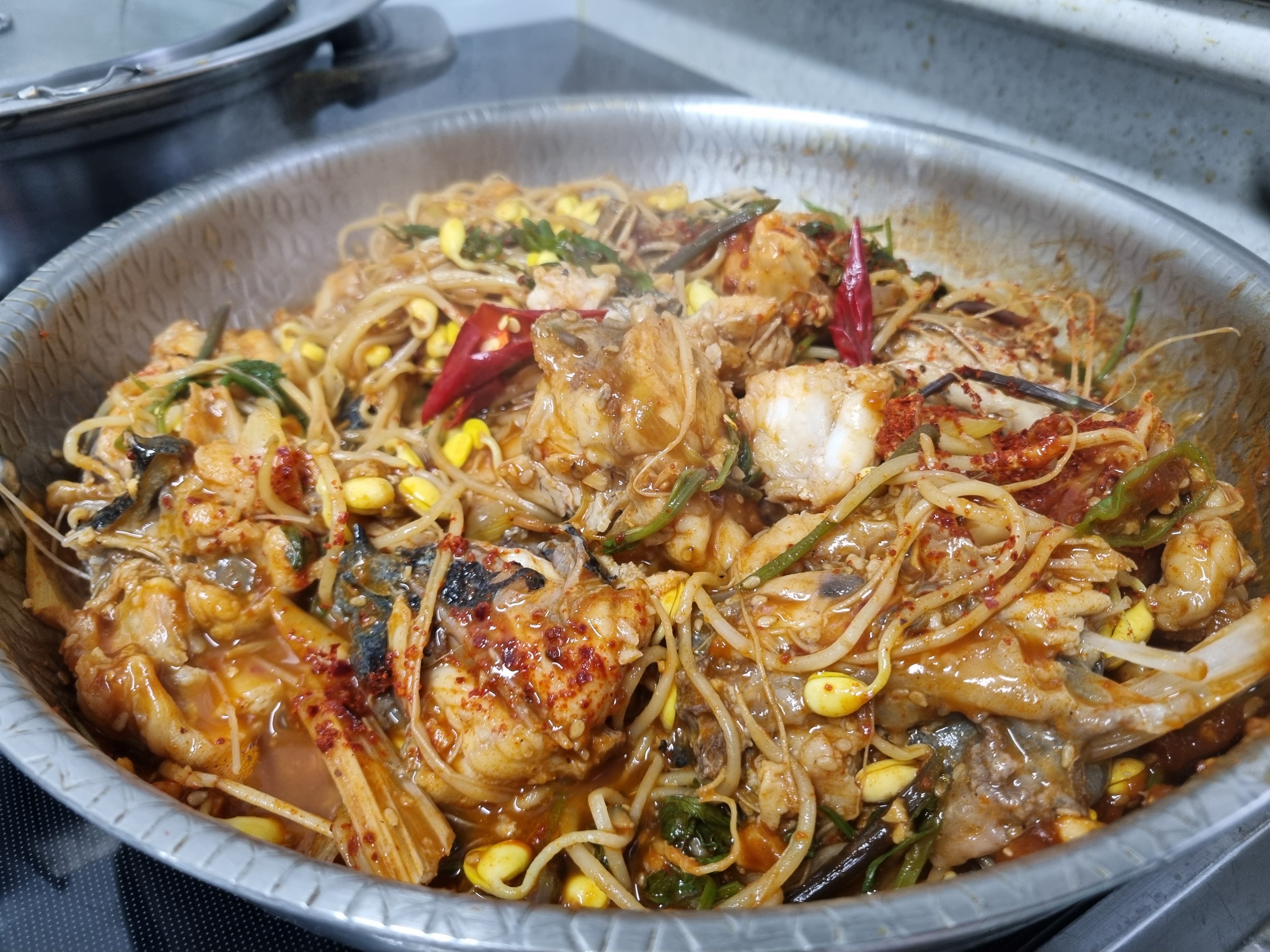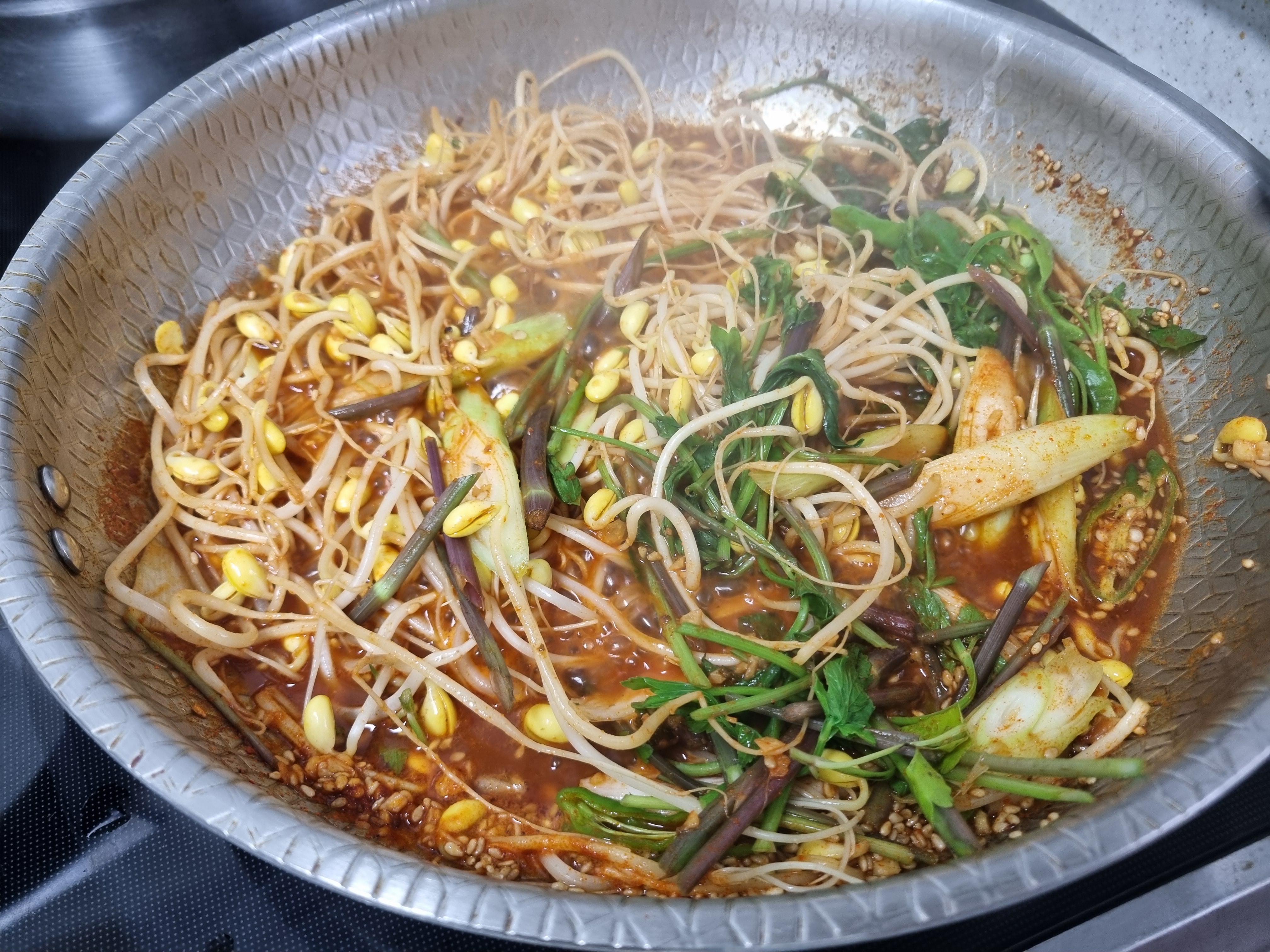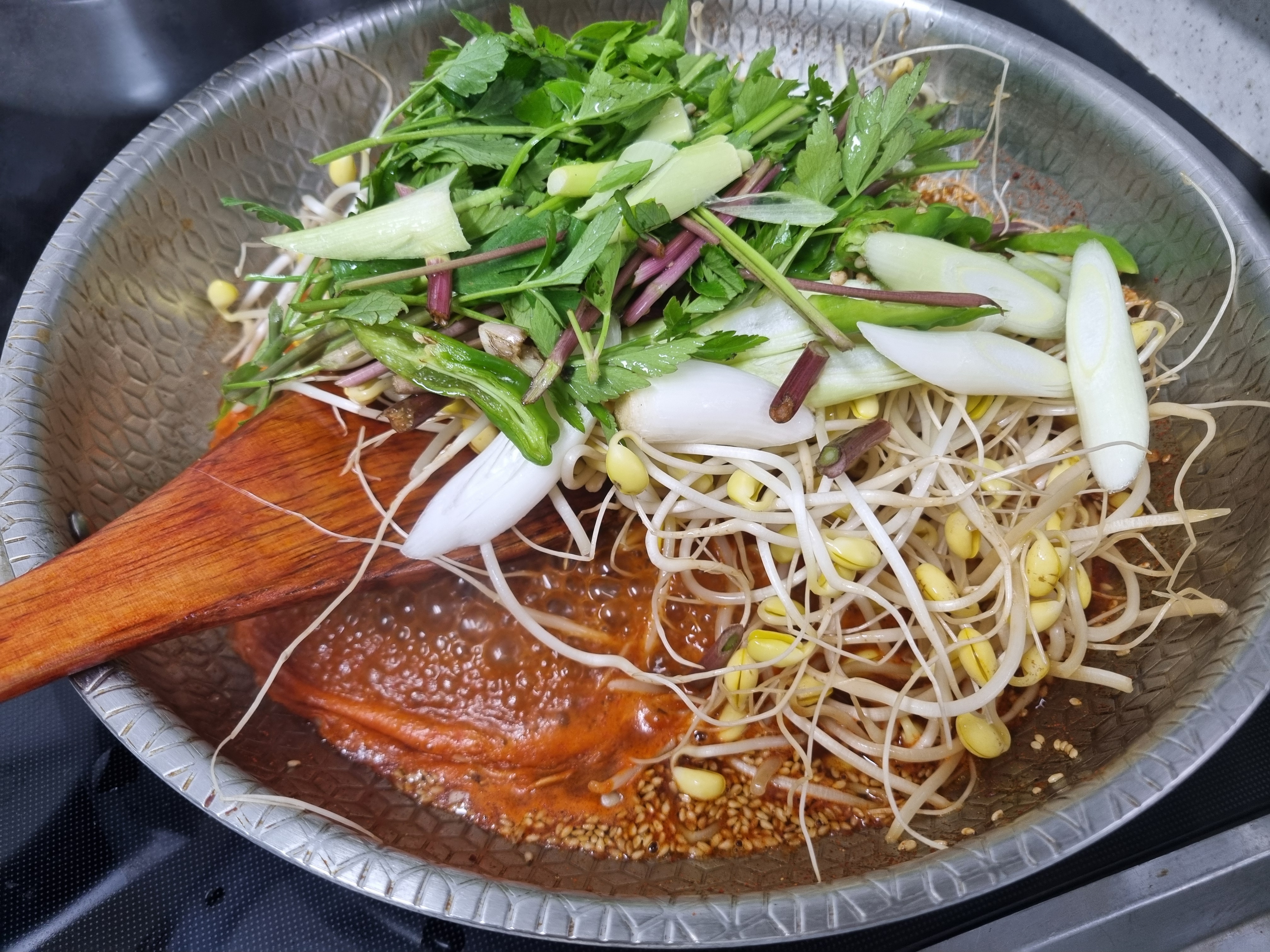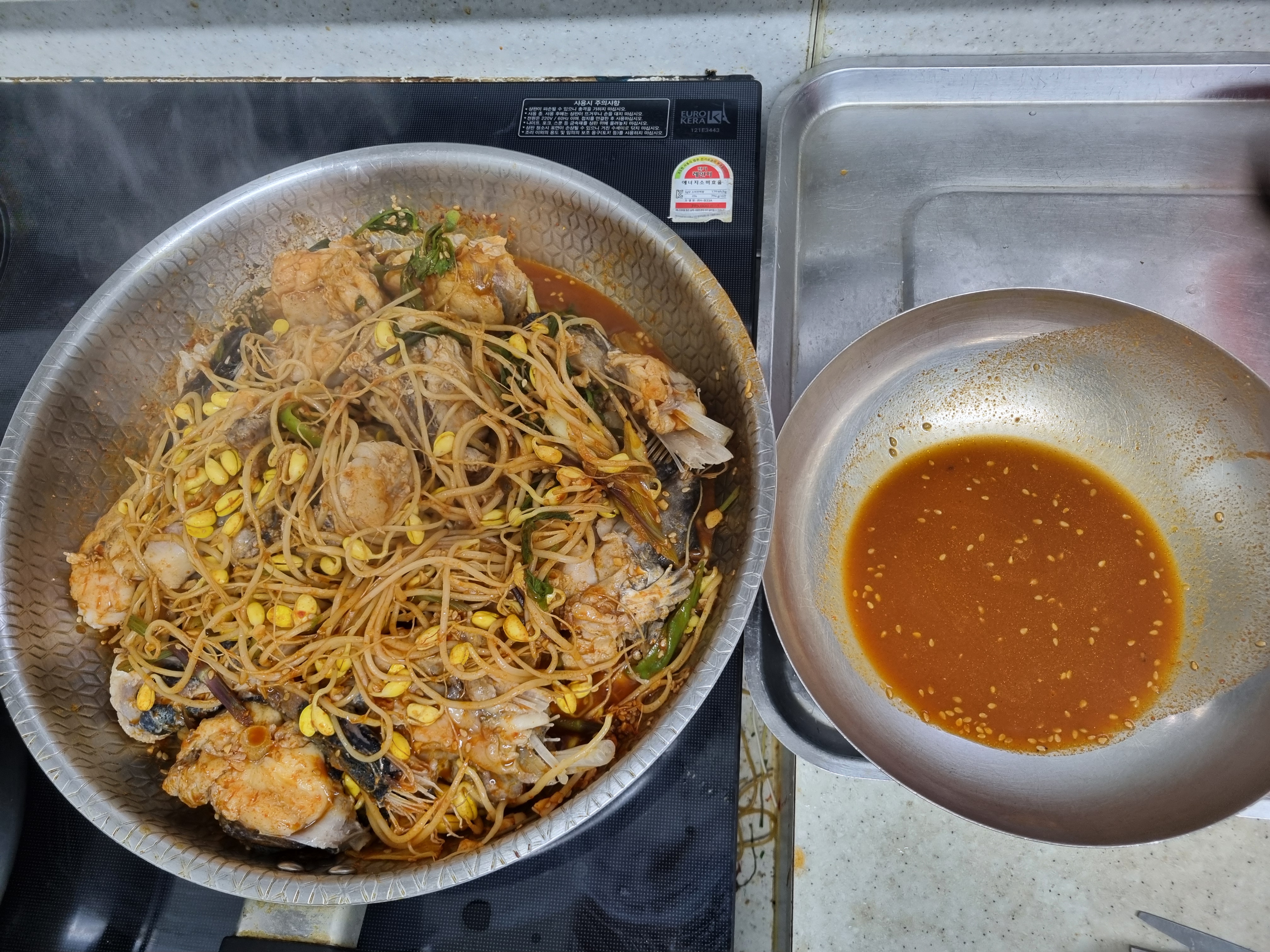 아구를 쪄 내고 양념장을 졸여 콩나물. 미나리. 대파 익혀 내고