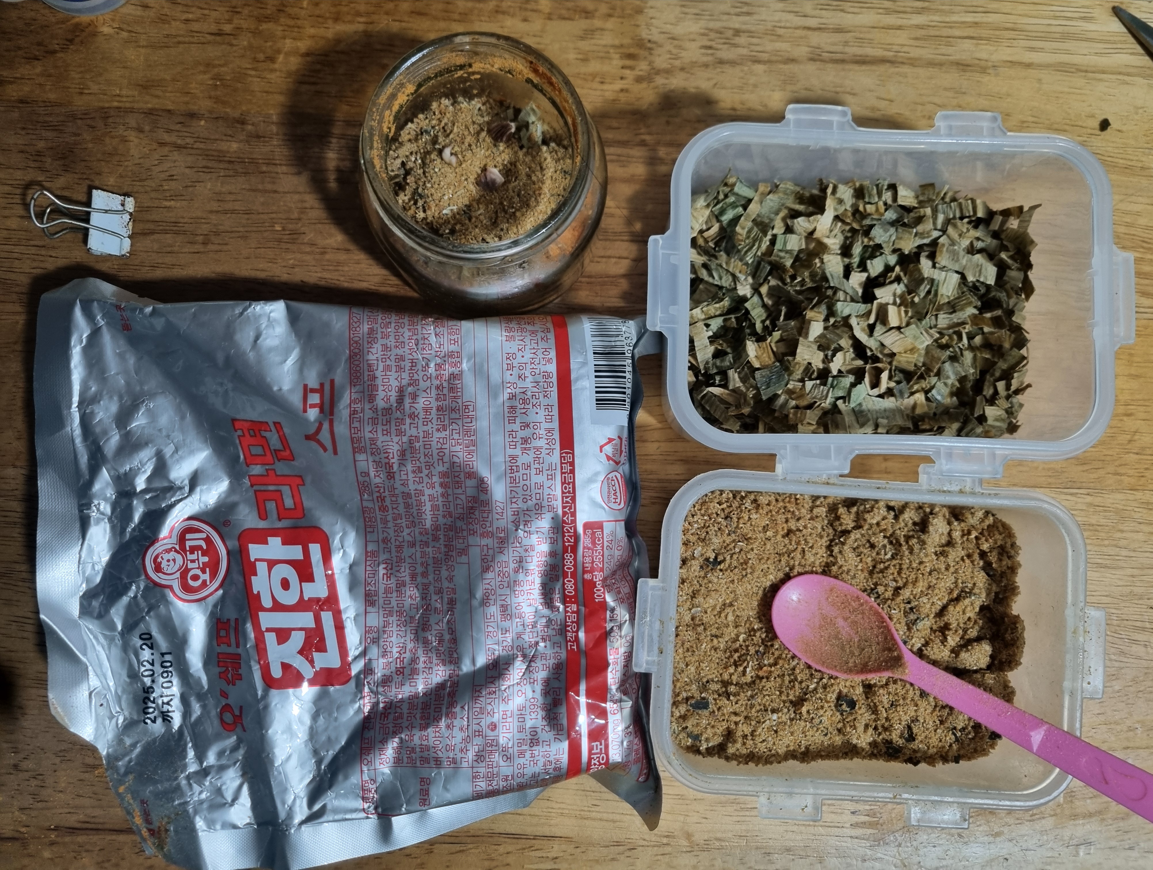 사리면을 사고 인터넷 구입한 스프와 보리새우+멸치+다시마 3가지를 합께 간 천연 조미료.
