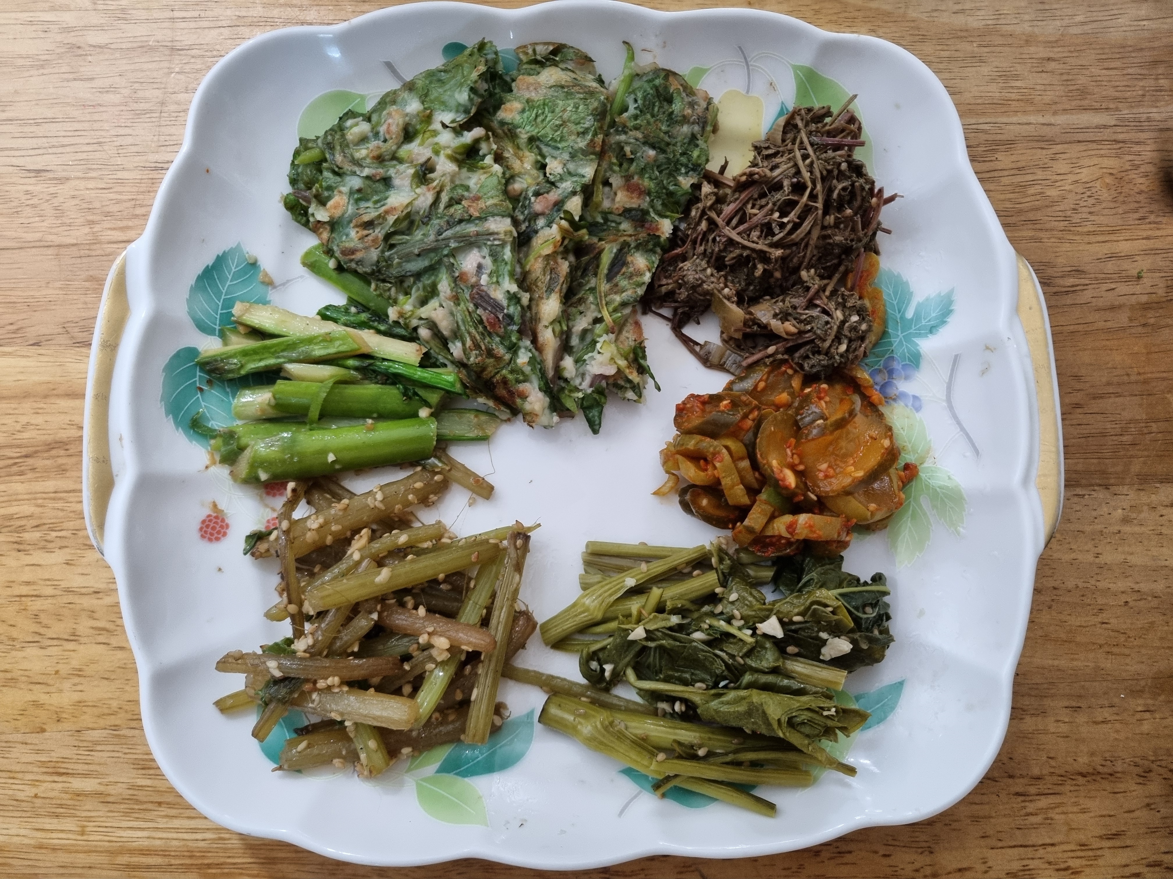 (10초 전. 고비 나물. 오이지 무침. 취 나물. 머윗대 볶음. 아스파라거스 볶음 한접시에 6가지 반찬이다)