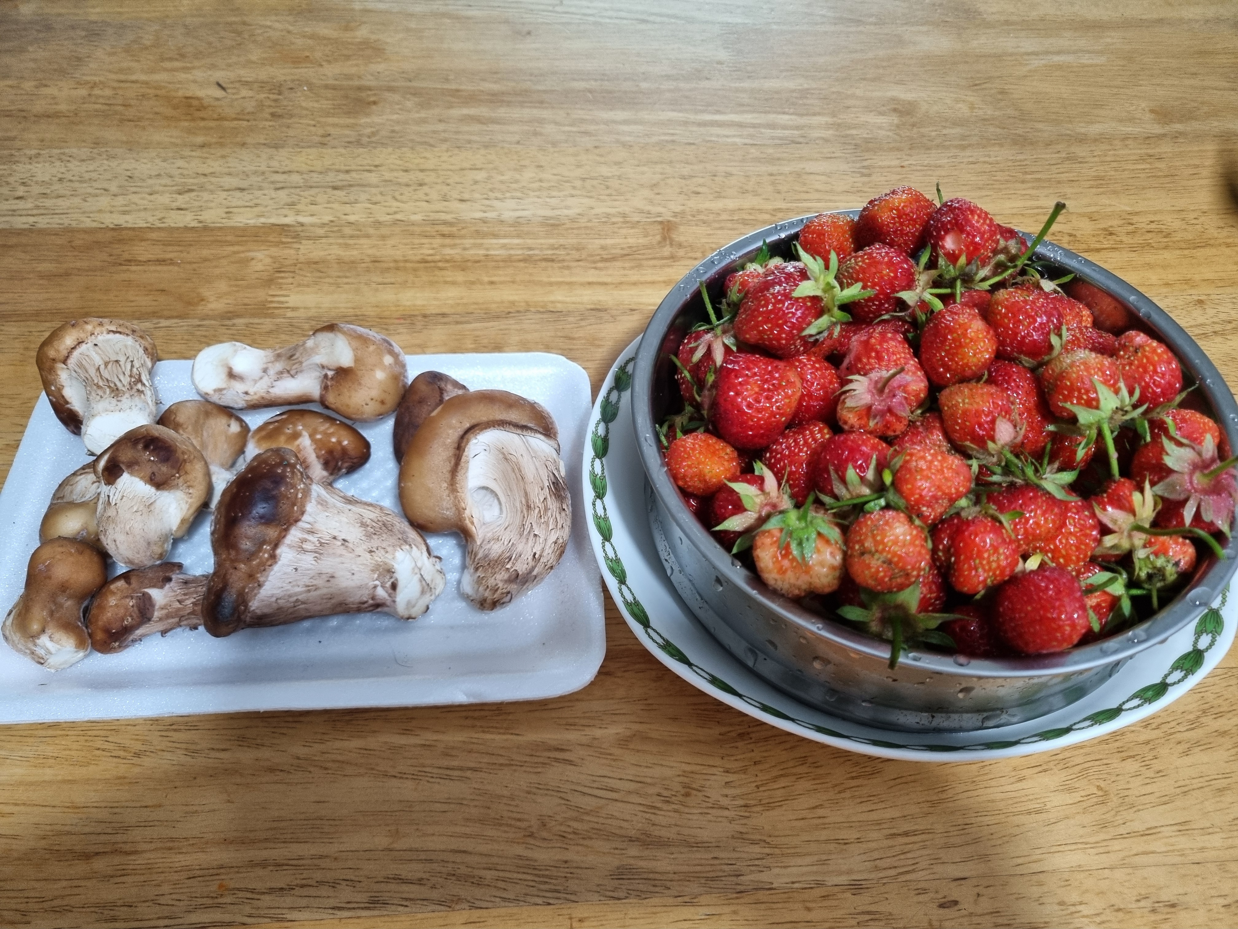( 밭에서 2차로 따몬 딸기. 귀가하며 들린 하나로 마트에서 참송이 버섯을 샀다)