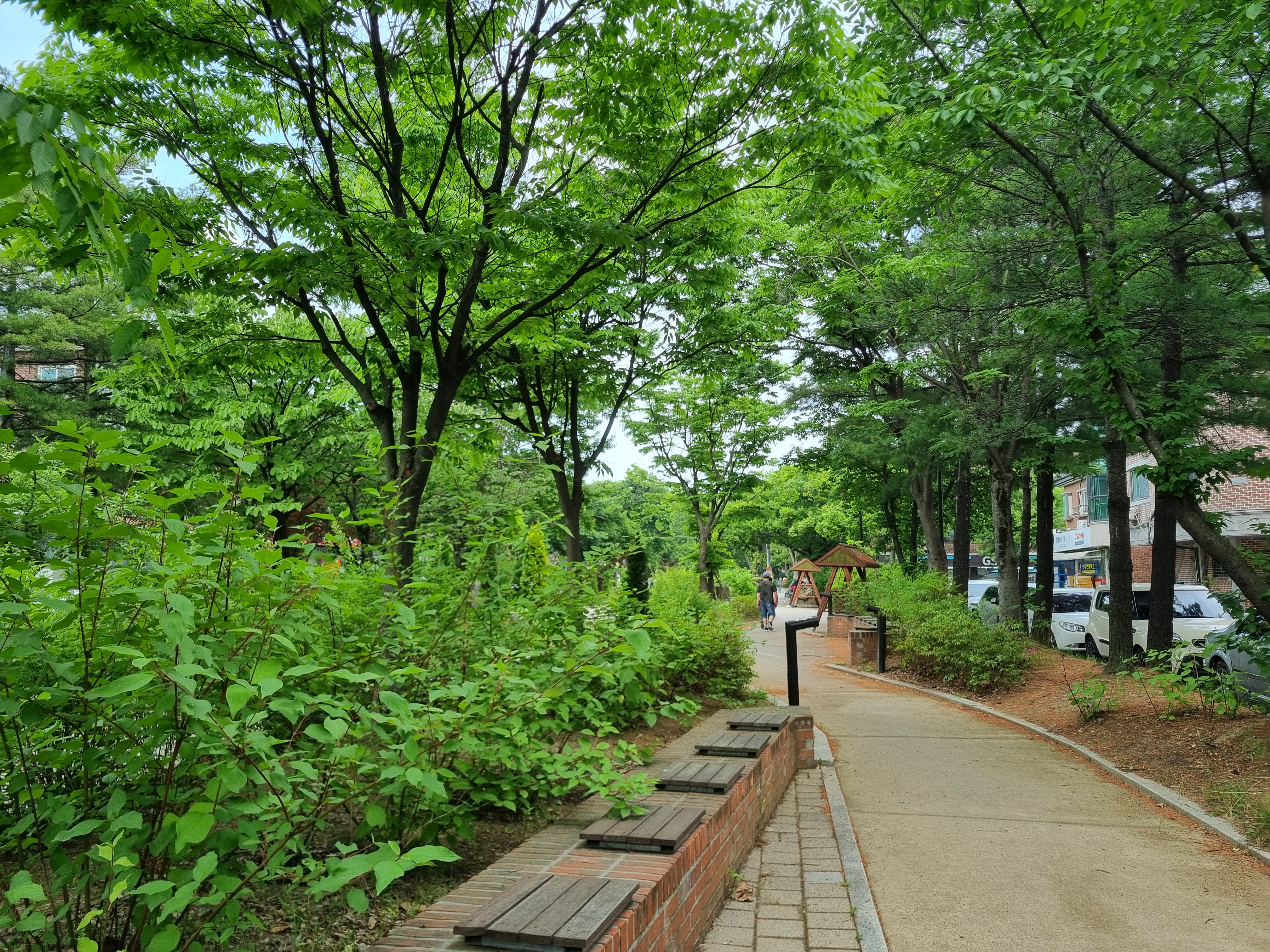 집에서 커피를 참았다가 만나 잠깐 공원 길을 걸었다