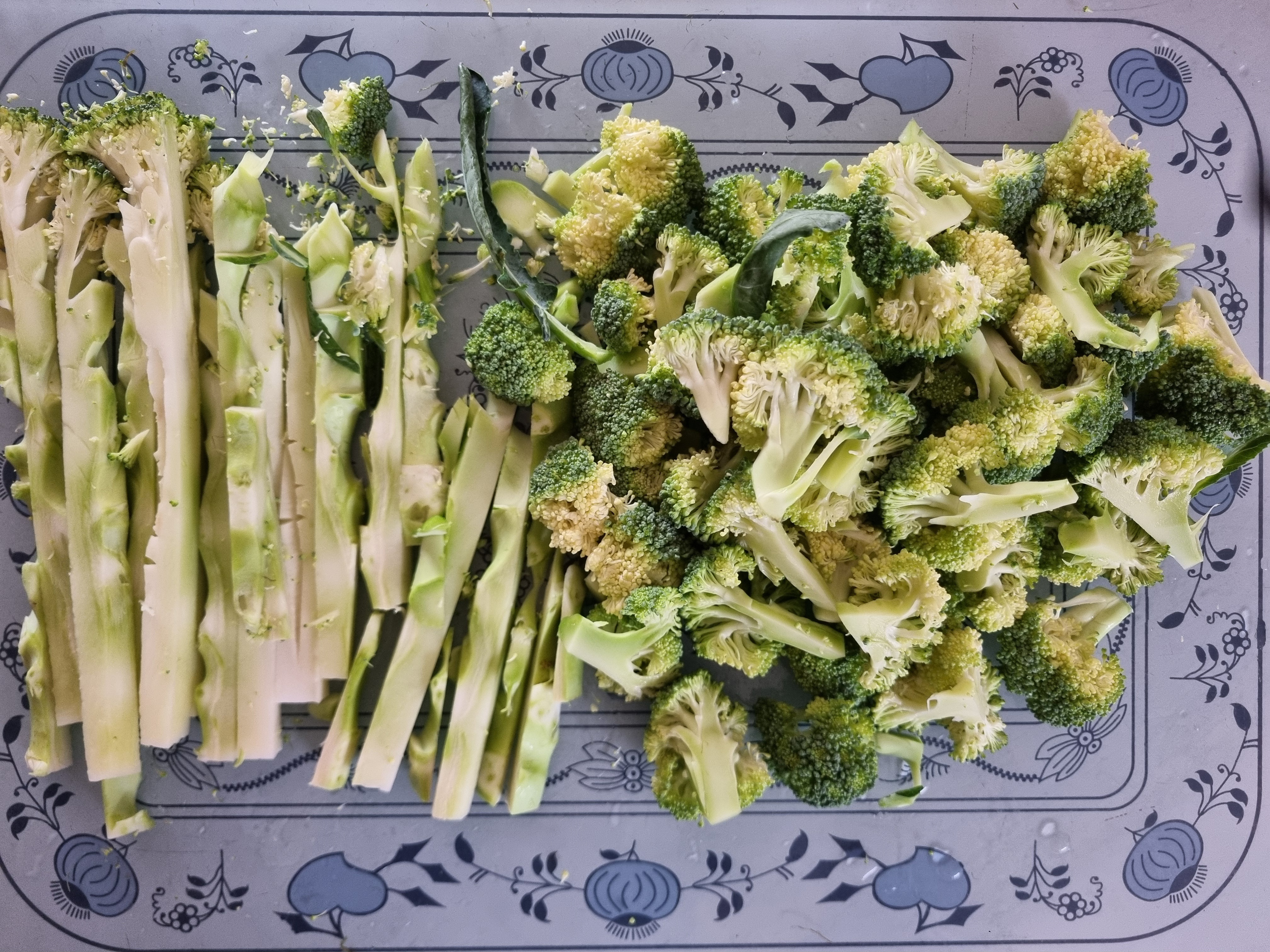 브로콜리 줄기 부분은 길이로 썰고. 꽃송이는 잘게 나누어