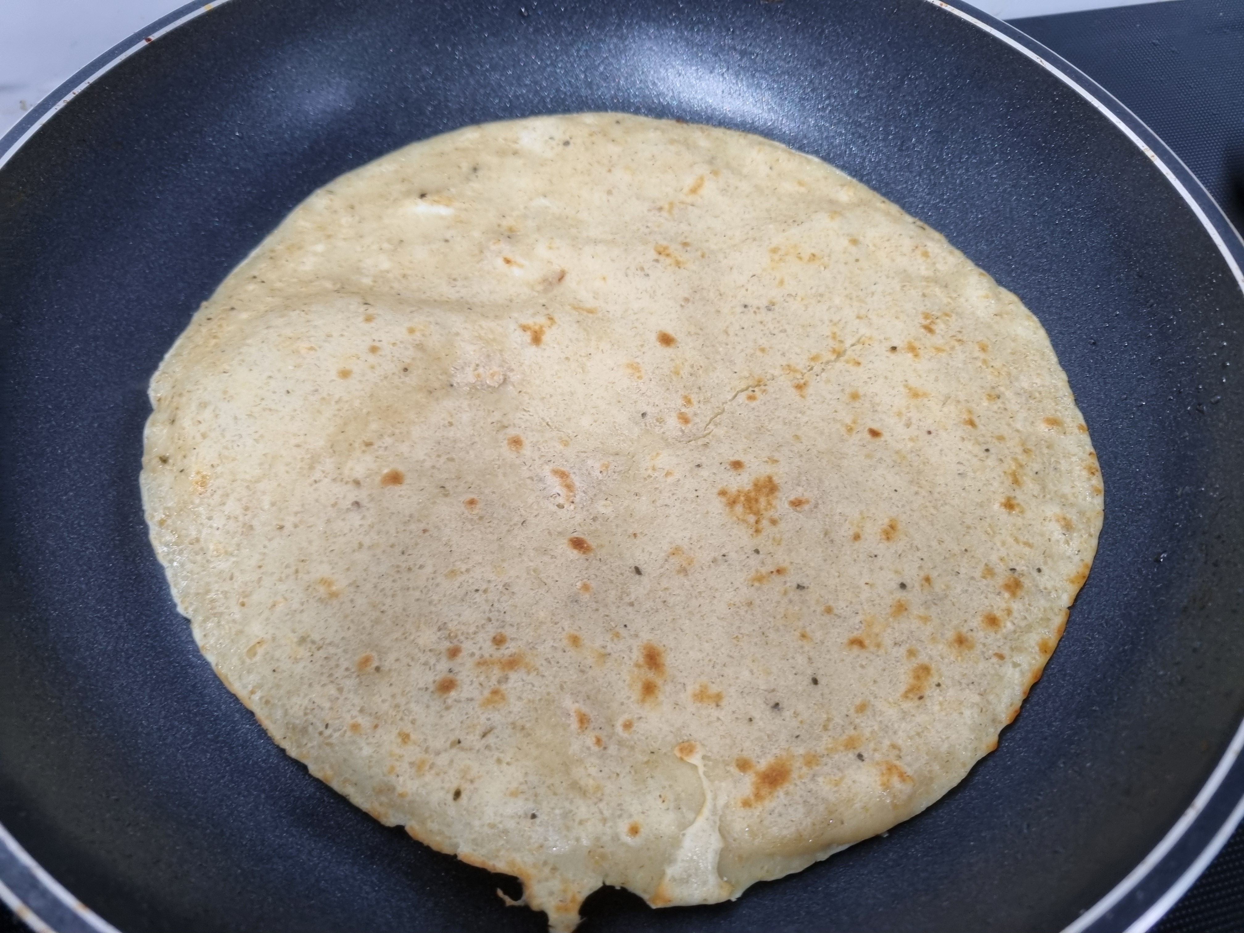 예열된 팬에 기름 없이 전병 반죽 약 100g을 넣고 뒤집어 가며 노릇한 반점이 생기도록 익혀냈다