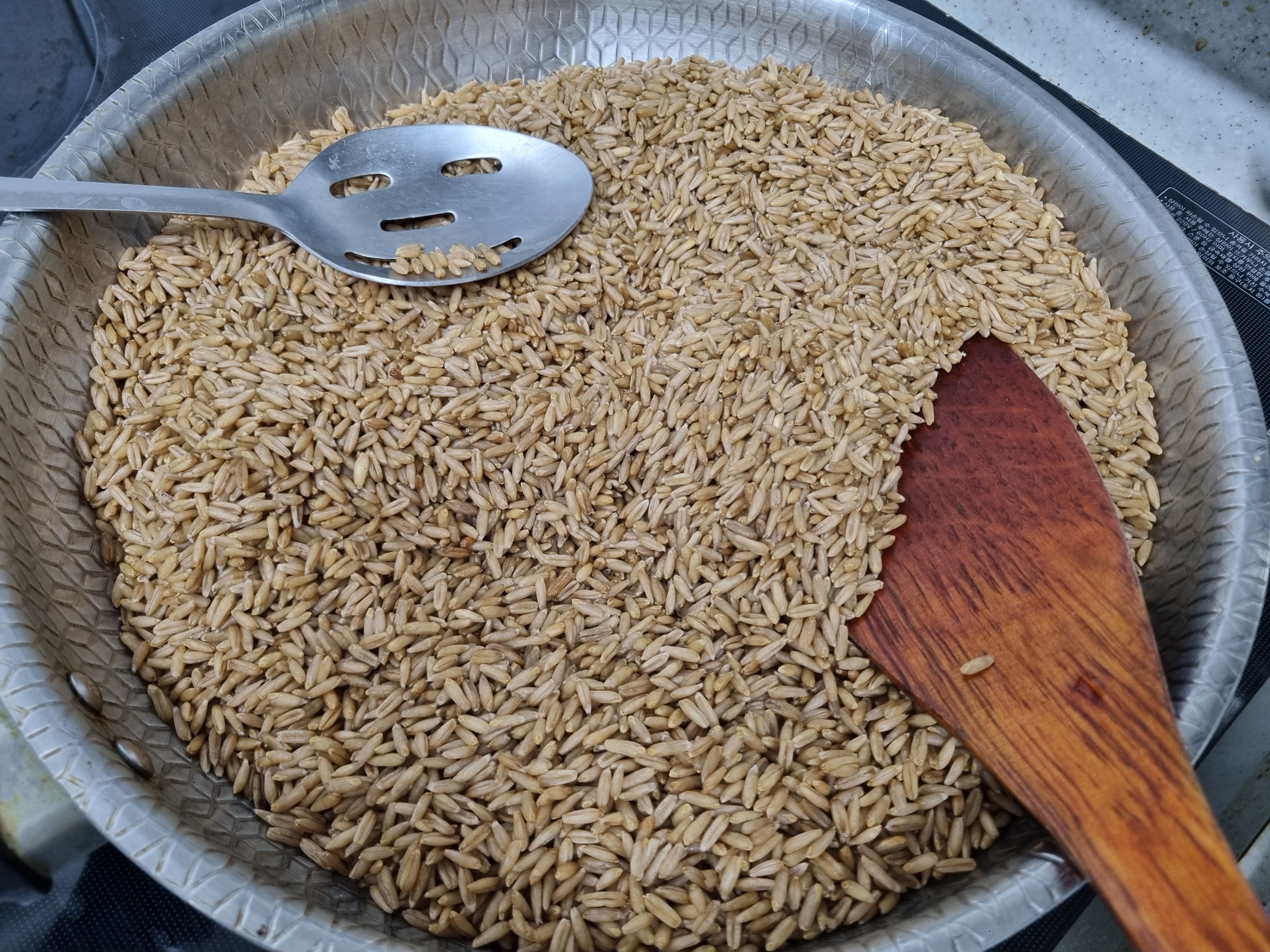 귀리를 씻어 찜판에 얹어 쪄내 말린 뒤 볶아 수분을 최소화하면 장기 보관도 기능하겠기에 분쇄 날로 갈았다
