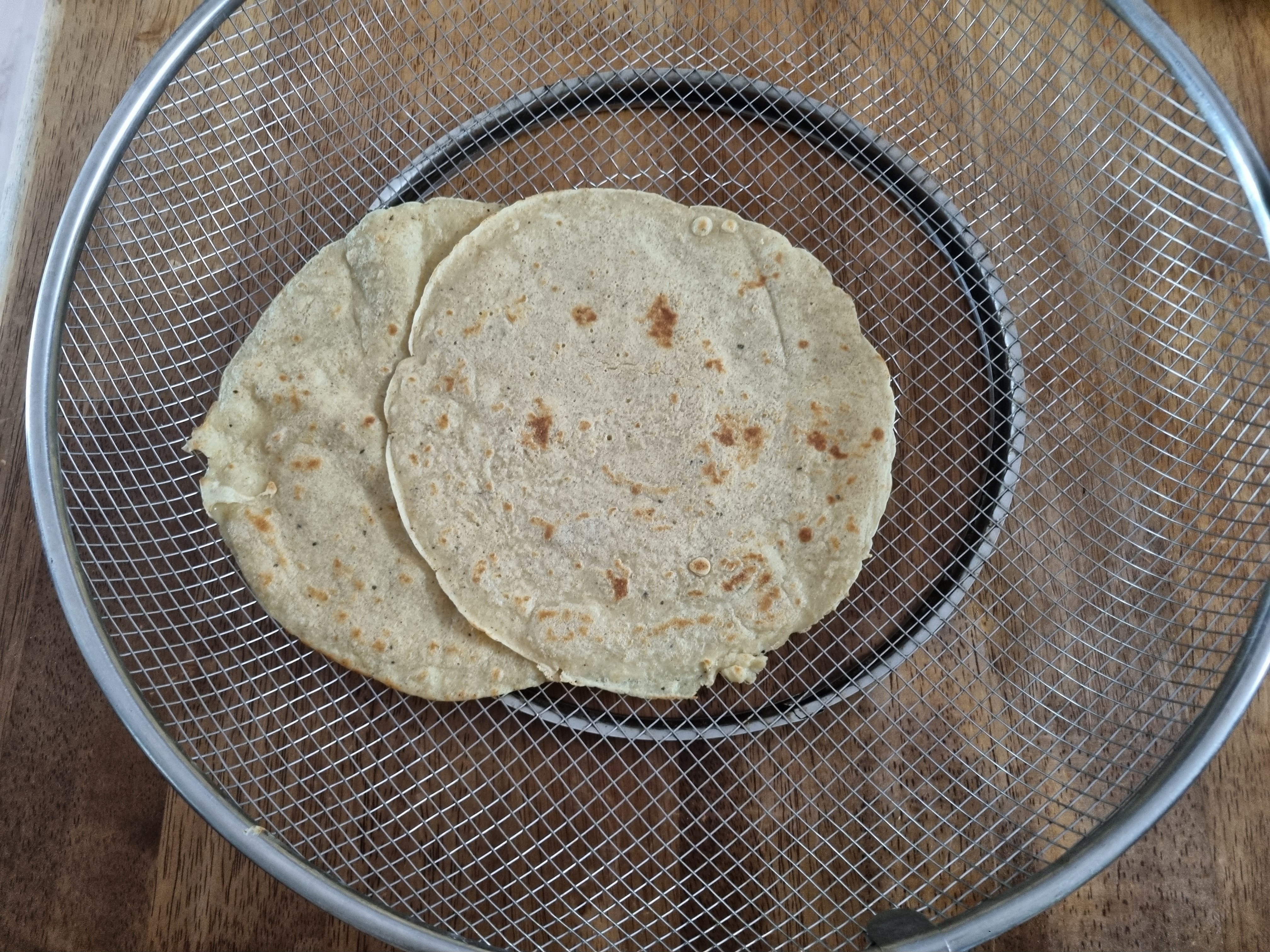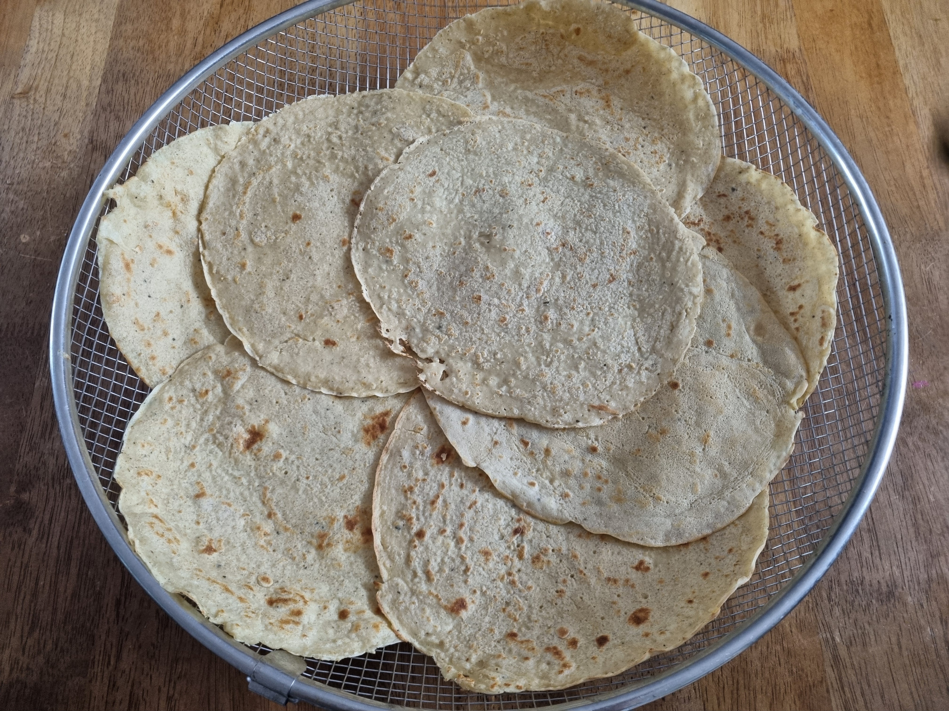 수입 밀가루 2 밥술. 우리밀 밀가루 2 밥술 반. 귀리 가루 3 밥술 반. 계란 2개. 소금. 설탕 조금씩. 식용유 반스푼. 우유와 물을 반반 섞어 잘 풀어 반죽했다