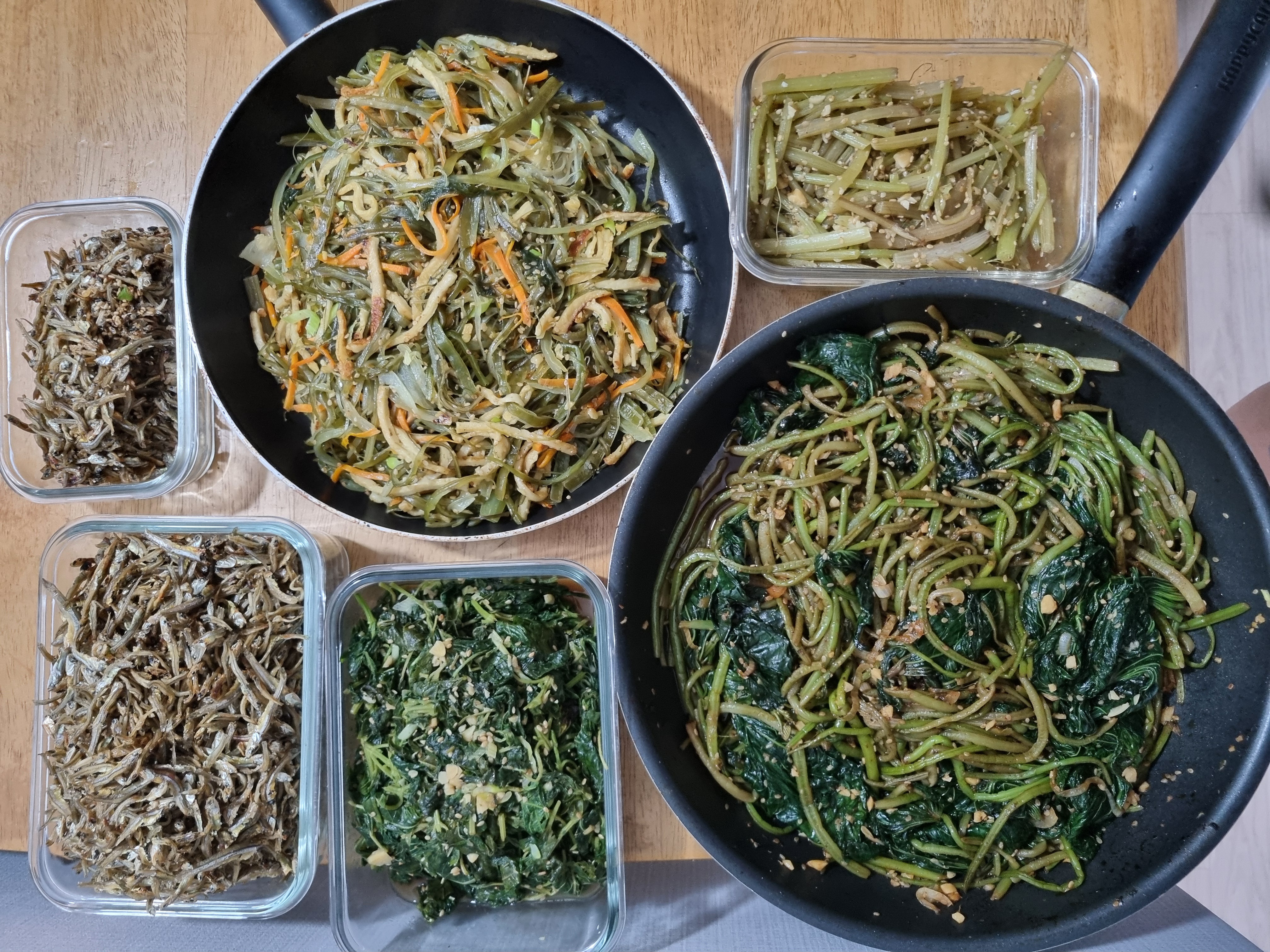 머윗대. 고구마순. 깻잎. 멸치. 미역줄기. 애호박 볶음 끝났다