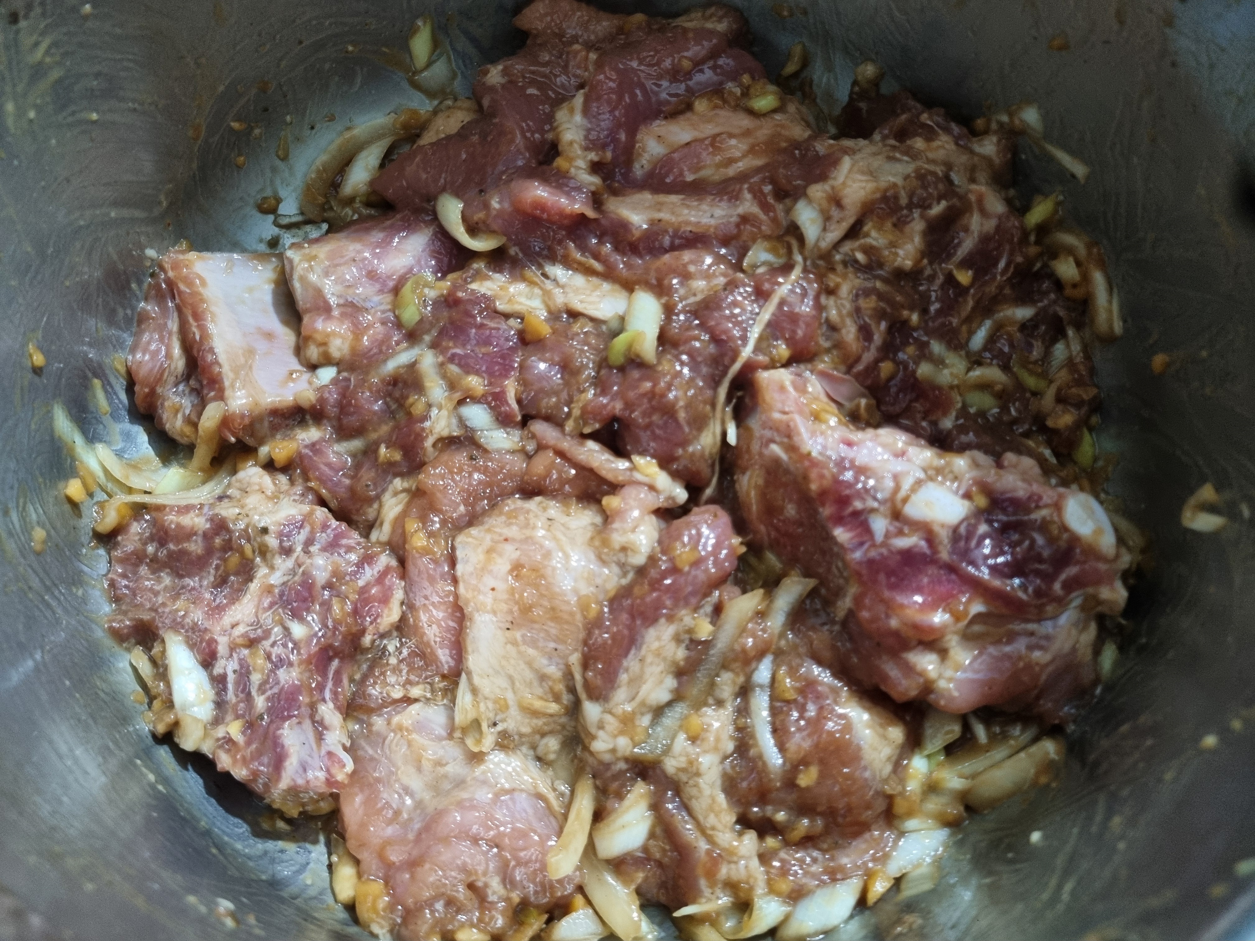 진간장 5 밥술. 우스타 소스 1 밥술 스테이크 소스 1 밥술. 미림 1 밥술. 파소주 1 밥술. 액젓 1밥술 배소주 3 밥술. 파인애플즙