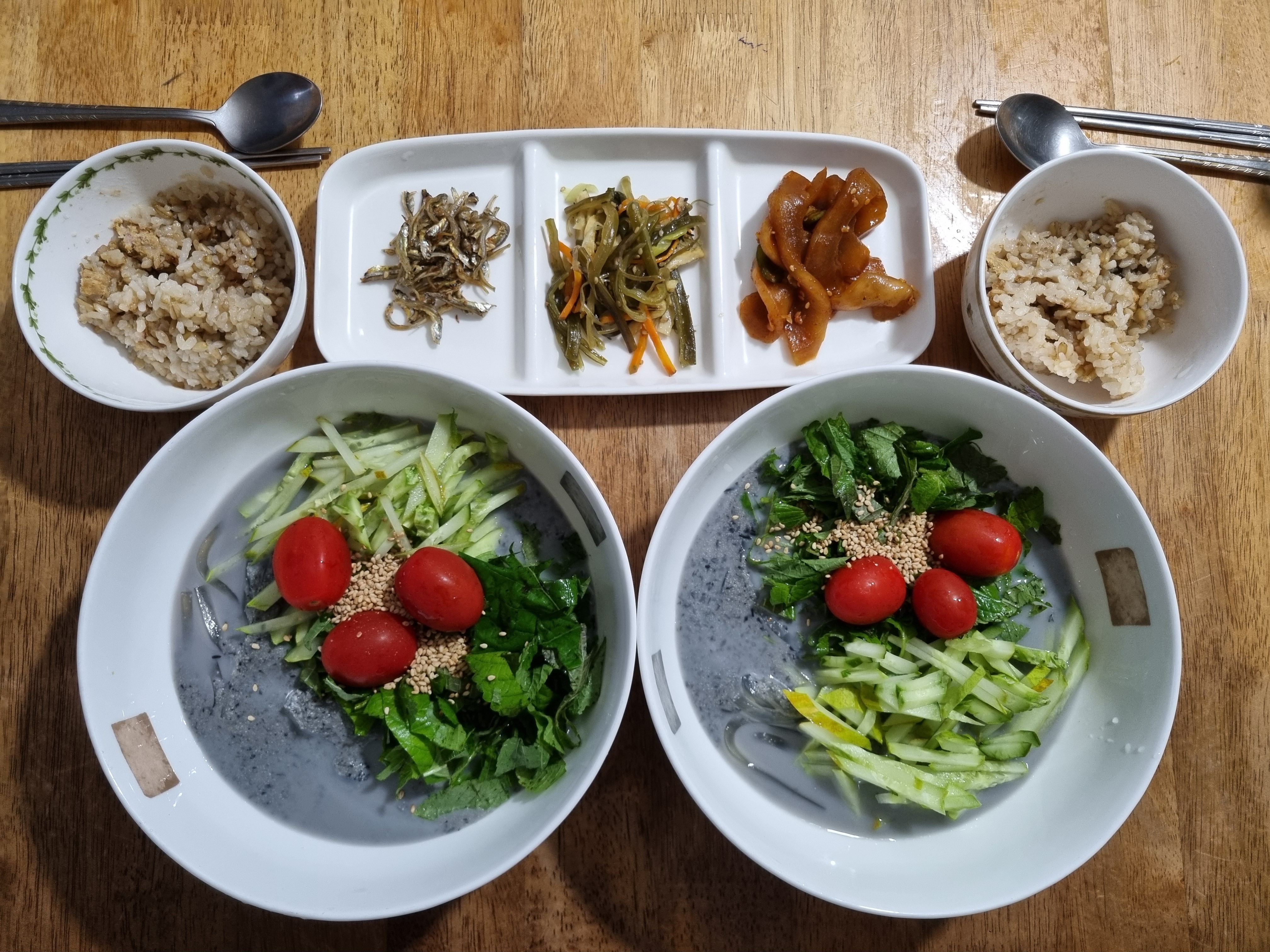 며칠전 콩물 갈아둔것 상하기 전 먹으려 우무 서리태 콩국을 부어 먹었다