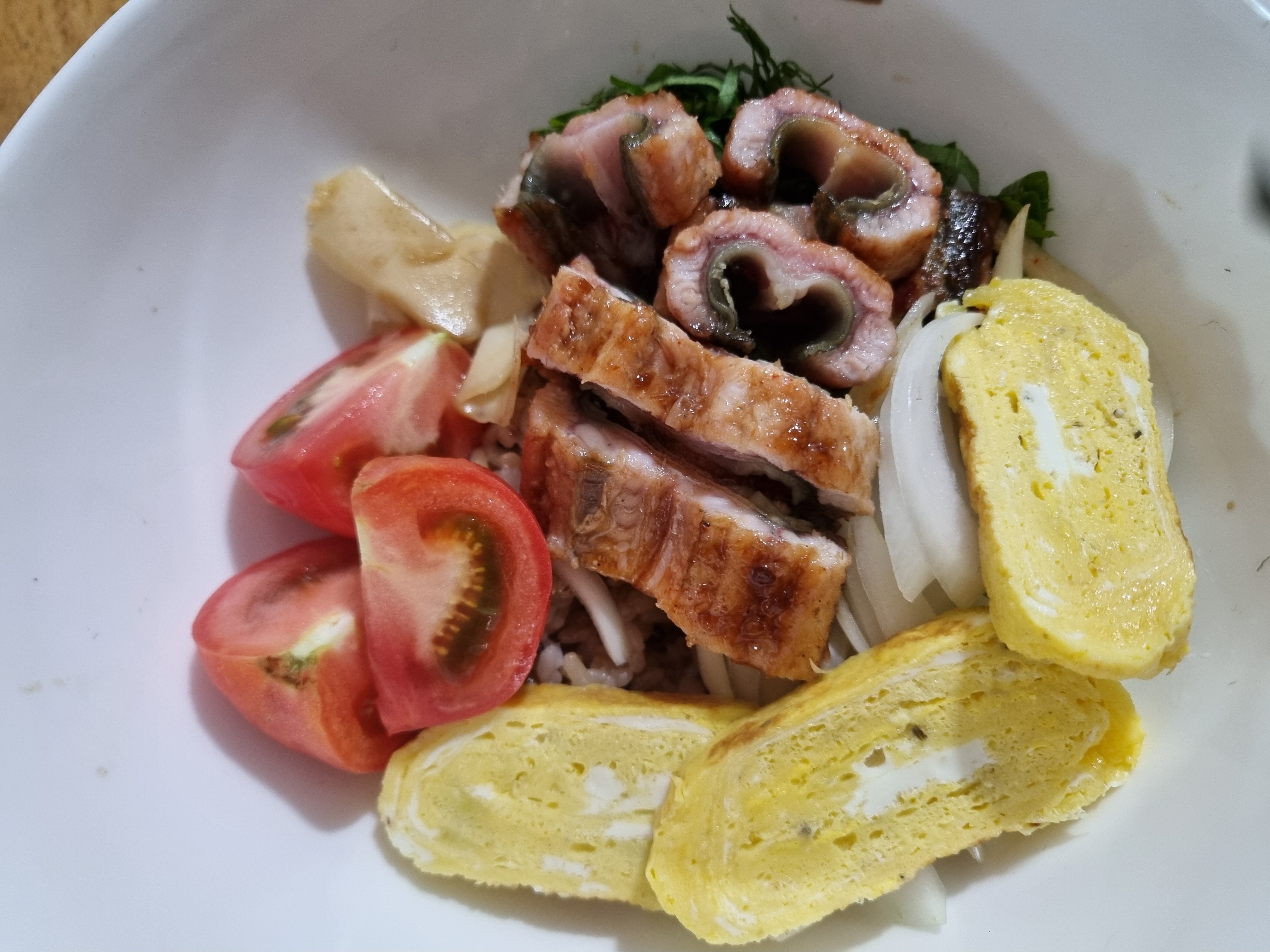 (풍천장어로 만든 장어밥 : 밥 깻잎+파. 양파. 초생강. 계란말이. 토마토. 감태 2장도 구워 3인 한 끼 먹었다)