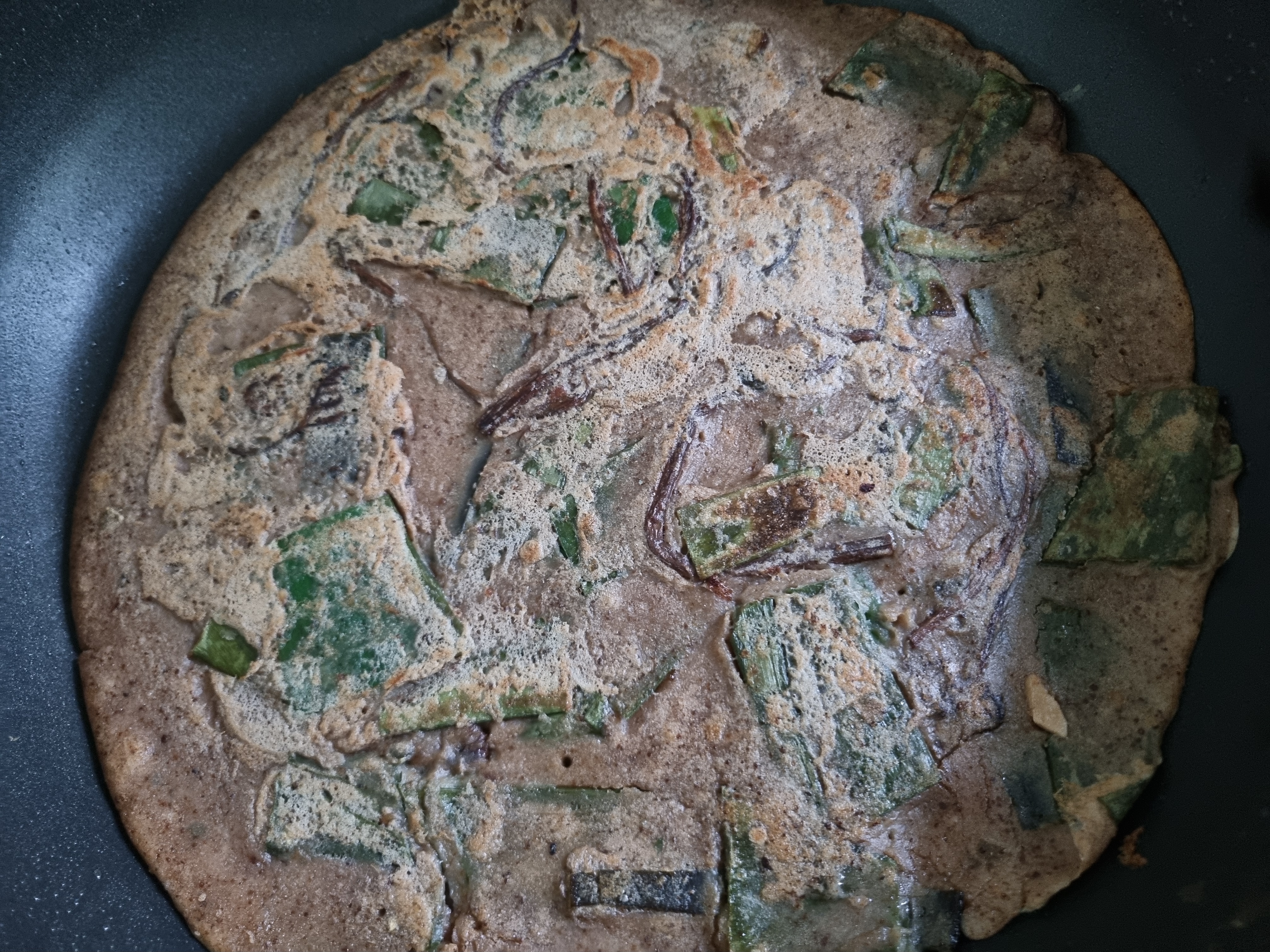 넘쳐 나는 파 절이를 썰어 넣고 전믈 부쳤다