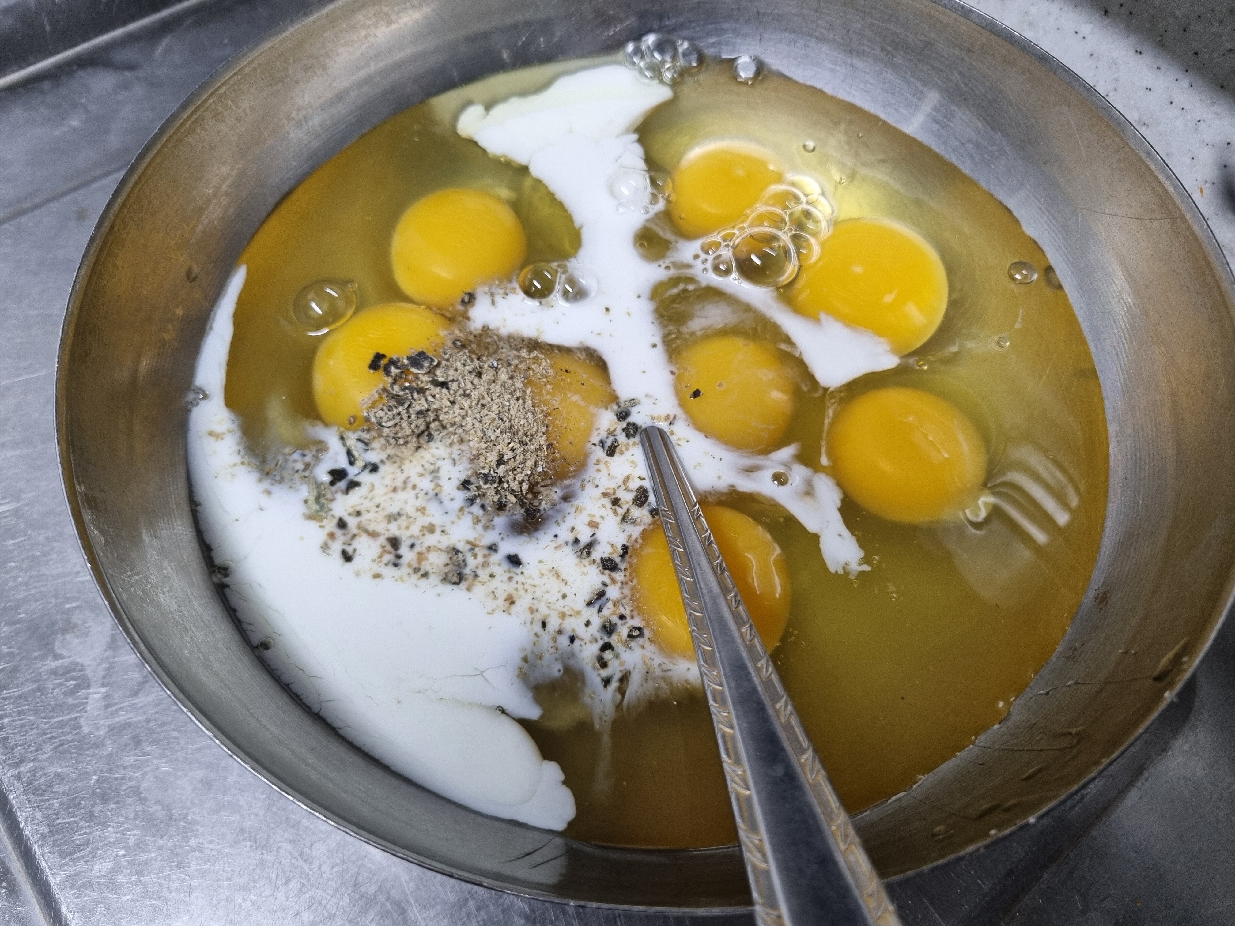 계란 8개. 맛소금. 소금 아주 조금씩 . 분말 조미료. 미림 1밥술. 우유 5밥술 넣고 포크를 이용해 잘 풀어준다