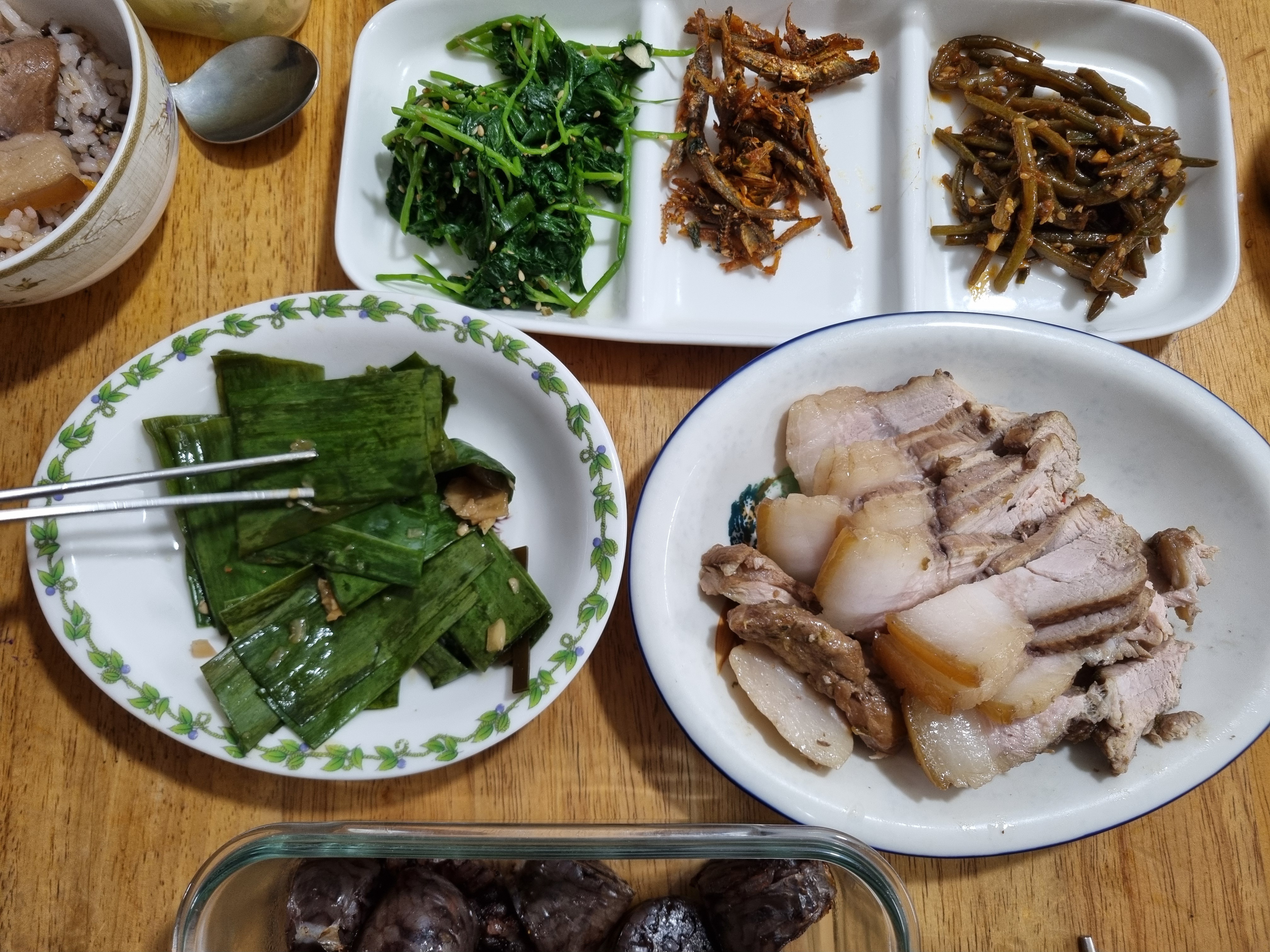 수육을 삶아 상에 올리며 양파 + 대파 잠아치도 올렸다